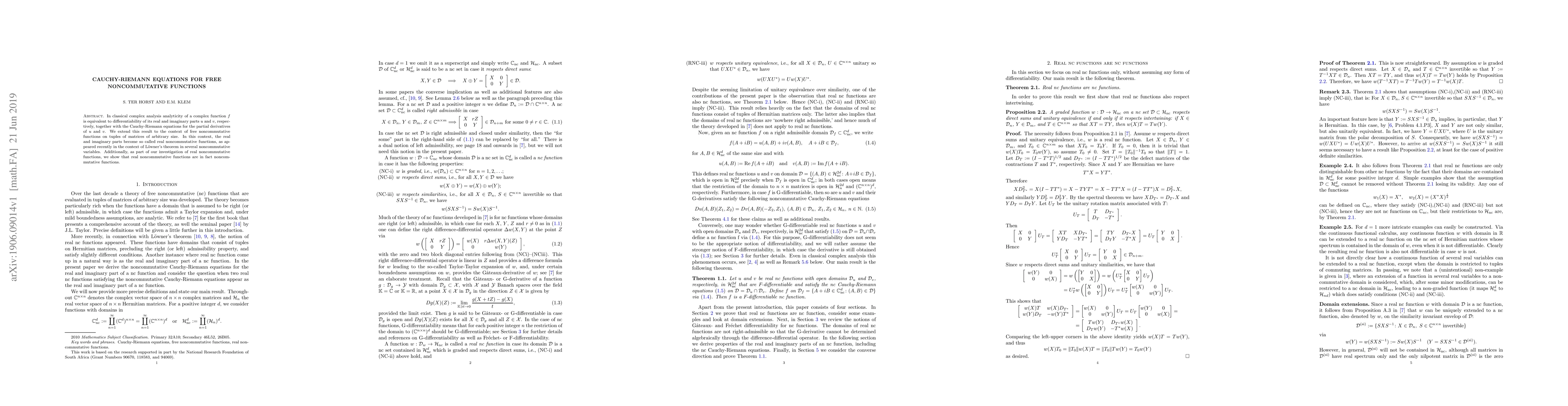 This paper extends the classical Cauchy-Riemann equations to free noncommutative functions on tuples of matrices, establishing the equivalence between analyticity and differentiability for these functions. It also demonstrates that real noncommutative functions are indeed a subset of noncommutative functions.