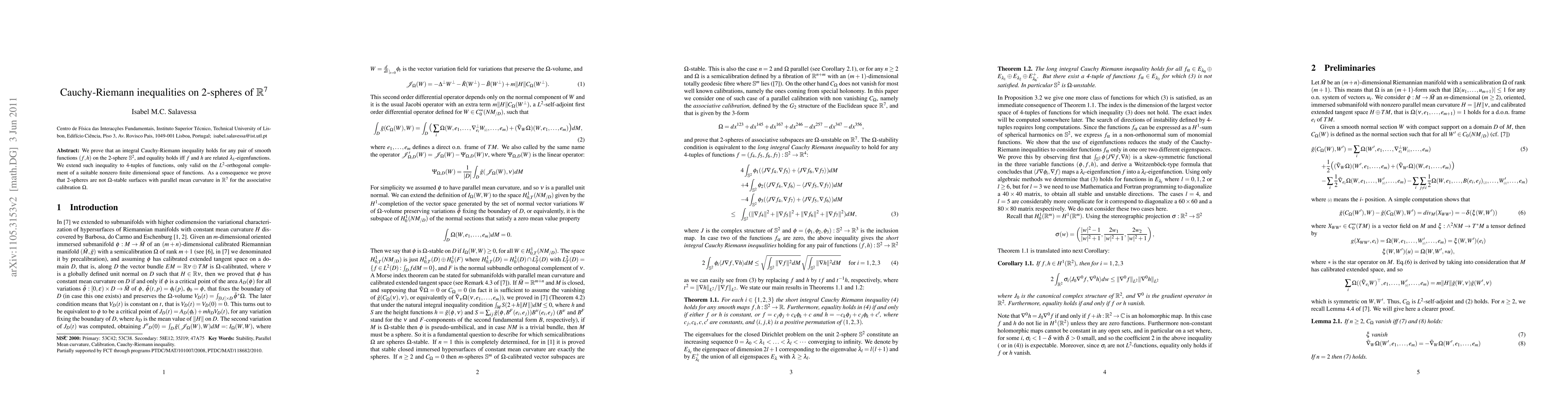 This paper proves an integral Cauchy-Riemann inequality for smooth functions on $\mathbb{S}^2$ in $\mathbb{R}^7$, with equality occurring when functions are $\lambda_1$-eigenfunctions. It extends this inequality to 4-tuples of functions and concludes that 2-spheres are not $\Omega$-stable surfaces with parallel mean curvature for the associative calibration $\Omega$.