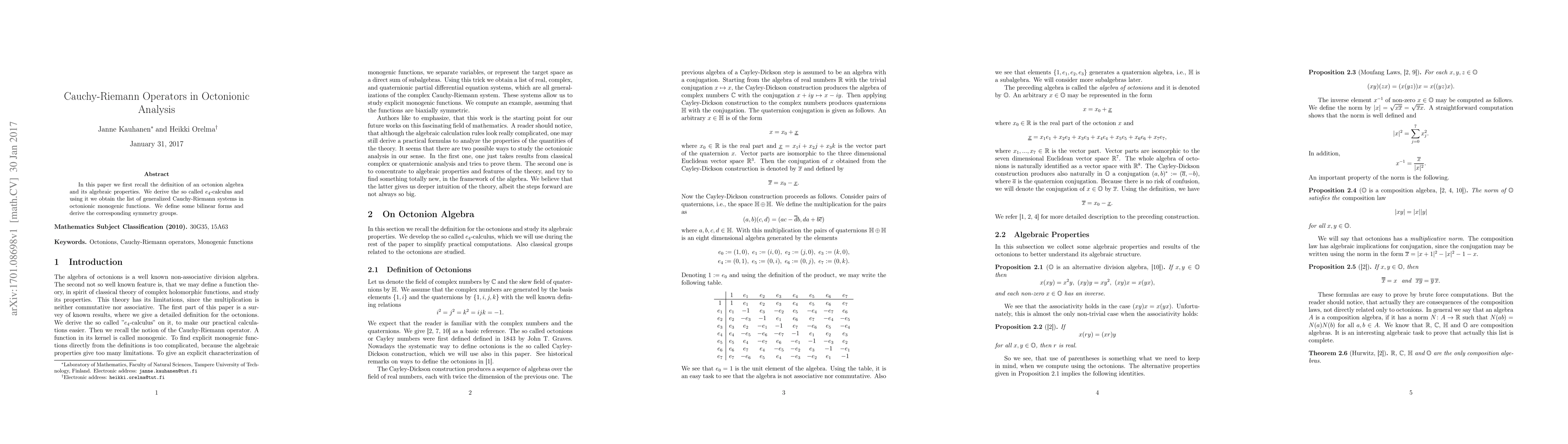 Researchers derived Cauchy-Riemann operators for octonionic analysis, a new approach to solving equations using 8-dimensional algebraic structures, and identified symmetry groups associated with these operators.