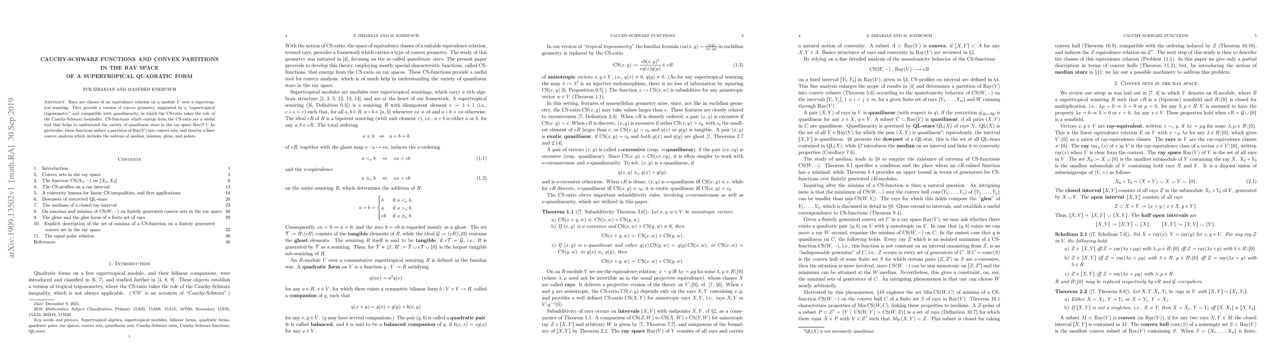 This paper explores the application of Cauchy-Schwarz functions in the ray space of a supertropical quadratic form, demonstrating how these functions facilitate a convex partition of the ray space, enhancing the understanding of quasilinear stars and introducing concepts like medians, minima, glens, and polars.