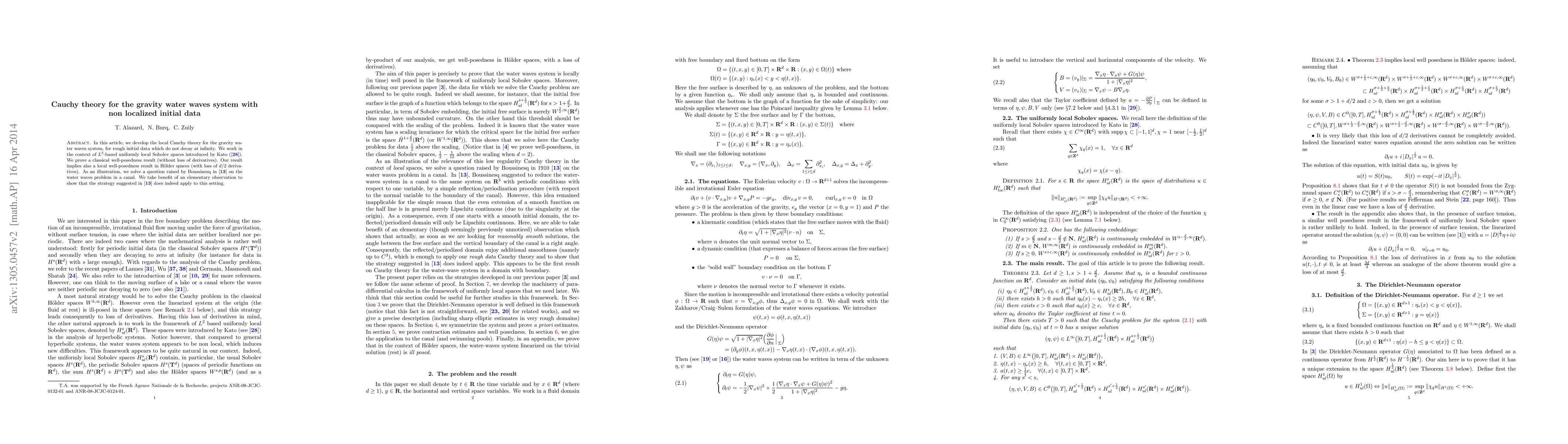 This paper develops local Cauchy theory for the gravity water waves system with non-decaying initial data, proving classical well-posedness in $L^2$-based Sobolev spaces and local well-posedness in H\"older spaces with derivative loss. It also demonstrates the applicability of Boussinesq's strategy to the canal water waves problem.