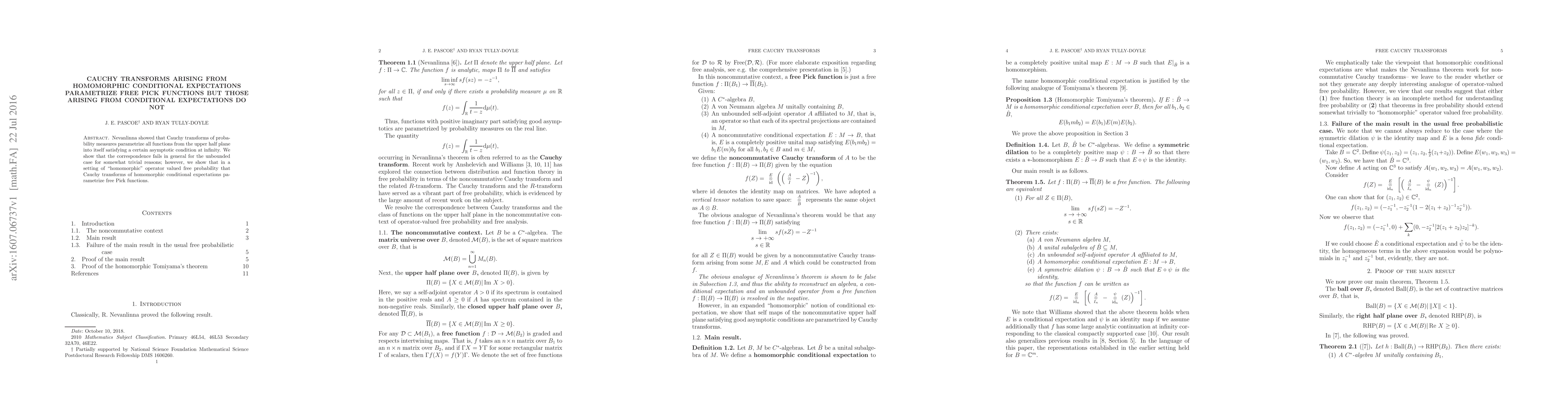 Nevanlinna showed that Cauchy transforms of probability measures parametrize all functions from the upper half plane into itself satisfying a certain asymptotic condition at infinity. We show that the correspondence fails in general for the unbounded case for somewhat trivial reasons; however, we show that in a setting of "homomorphic" operator valued free probability that Cauchy transforms of homomorphic conditional expectations parametrize free Pick functions.
