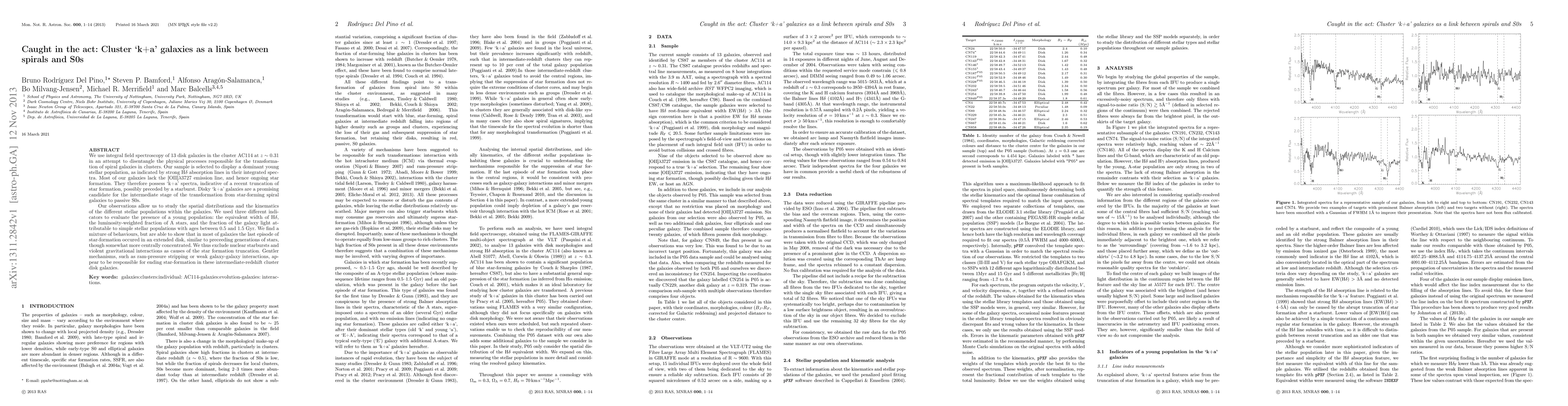 We use integral field spectroscopy of 13 disk galaxies in the cluster AC114 at z ~ 0.31 in an attempt to disentangle the physical processes responsible for the transformation of spiral galaxies in clusters. Our sample is selected to display a dominant young stellar population, as indicated by strong Hdelta absorption lines in their integrated spectra. Most of our galaxies lack the [OII] emission line, and hence ongoing star formation. They therefore possess `k+a' spectra, indicative of a recent truncation of star formation, possibly preceded by a starburst. Disky `k+a' galaxies are a promising candidate for the intermediate stage of the transformation from star-forming spiral galaxies to passive S0s. Our observations allow us to study the spatial distributions and the kinematics of the different stellar populations within the galaxies. We used three different indicators to evaluate the presence of a young population: the equivalent width of Hdelta, the luminosity-weighted fraction of A stars, and the fraction of the galaxy light attributable to simple stellar populations with ages between 0.5 and 1.5 Gyr. We find a mixture of behaviours, but are able to show that in most of galaxies the last episode of star-formation occured in an extended disk, similar to preceeding generations of stars, though somewhat more centrally concentrated. We thus exclude nuclear starbursts and violent gravitational interactions as causes of the star formation truncation. Gentler mechanisms, such as ram-pressure stripping or weak galaxy-galaxy interactions, appear to be responsible for ending star-formation in these intermediate-redshift cluster disk galaxies.