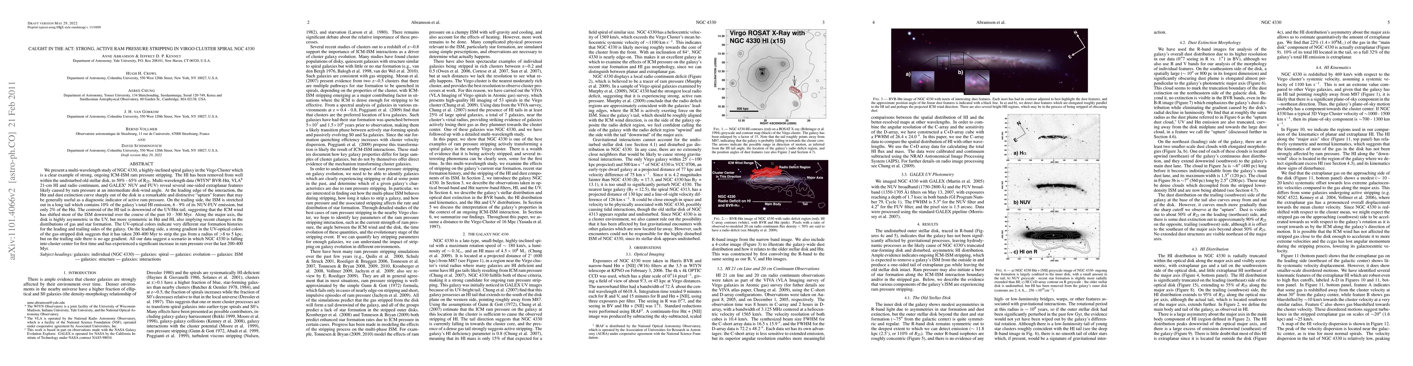 This study reveals strong, active ram pressure stripping in NGC 4330, a Virgo Cluster spiral galaxy, with significant HI removal and distinct "upturn" H-alpha features indicating ongoing interaction with the intracluster medium. The galaxy's asymmetric UV and HI distributions suggest recent changes in gas and star formation driven by the cluster environment.