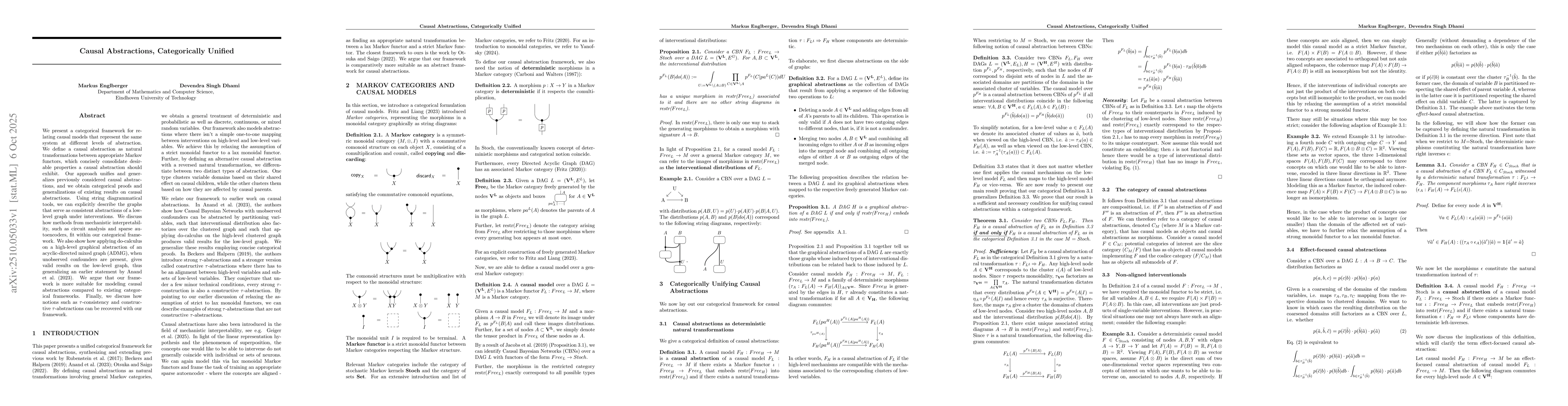 Formalizes causal abstractions as monoidal functors between free categories generated from DAGs, establishing a categorical equivalence between graphical models and their causal interpretations through string diagram factorization properties.