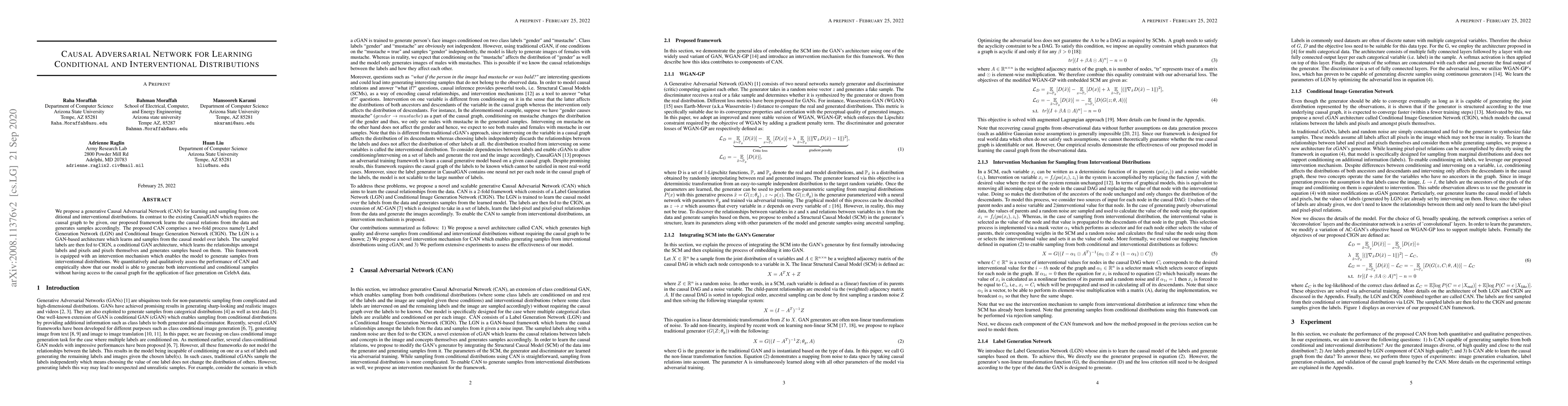 This paper proposes a Causal Adversarial Network (CAN) that learns causal relationships from data to generate conditional and interventional distributions. The CAN consists of a Label Generation Network and a Conditional Image Generation Network, enabling it to generate samples without requiring a pre-defined causal graph.