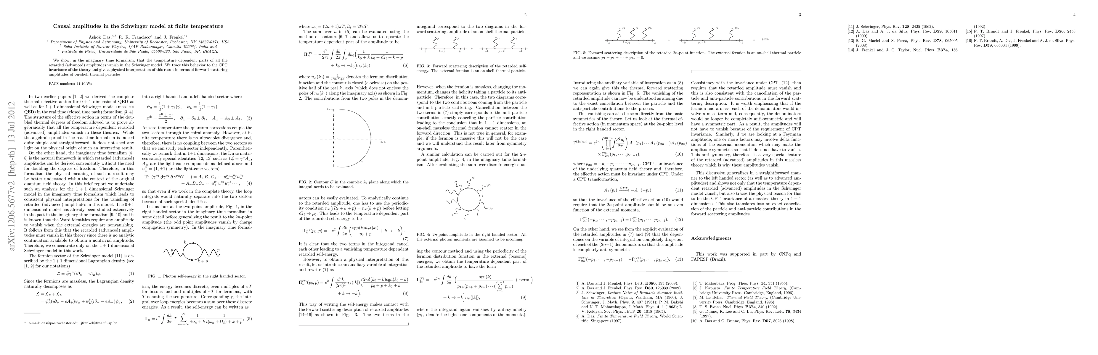 The novelty of this work lies in its physical interpretation of the algebraic result regarding the vanishing of retarded and advanced amplitudes in the Schwinger model, attributing it to CPT invariance and forward scattering of on-shell thermal particles.
