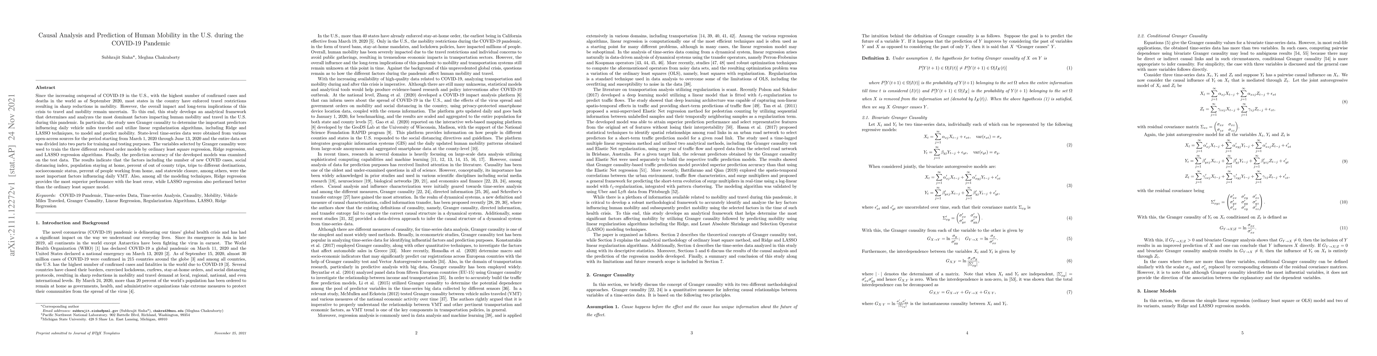 This study develops an analytical framework to determine and predict human mobility in the U.S. during the COVID-19 pandemic using Granger causality and linear regression techniques. The results highlight key factors like COVID-19 case numbers and social distancing, with Ridge regression showing the best predictive accuracy.
