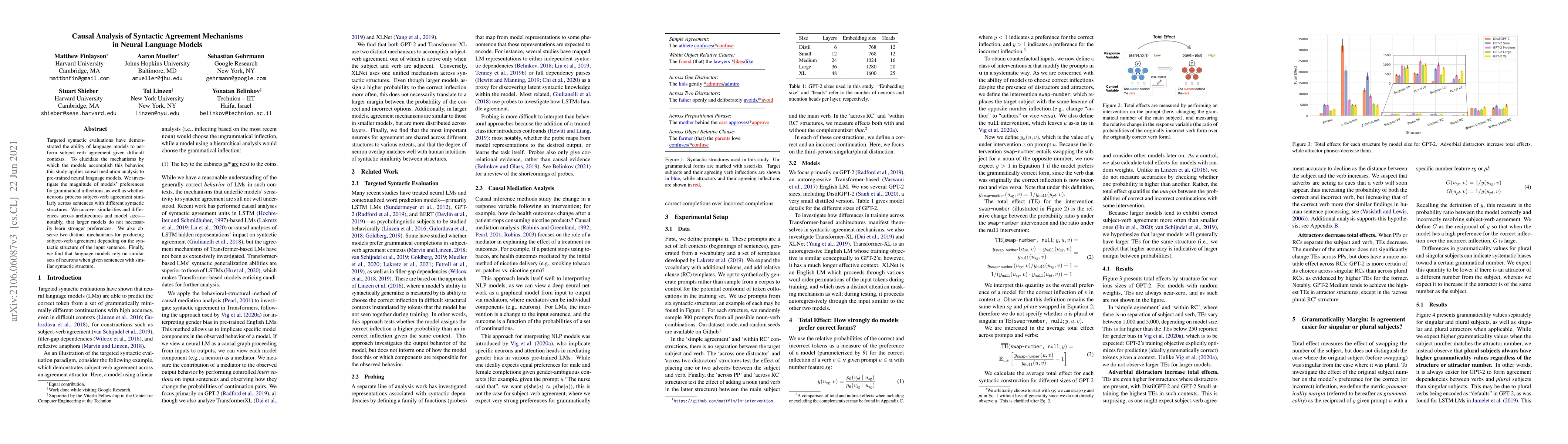 This study uses causal mediation analysis to explore how neural language models achieve subject-verb agreement, revealing two distinct mechanisms based on syntactic structure and showing that larger models do not always exhibit stronger preferences for grammatical inflections. It also finds that similar syntactic structures activate comparable neural pathways.