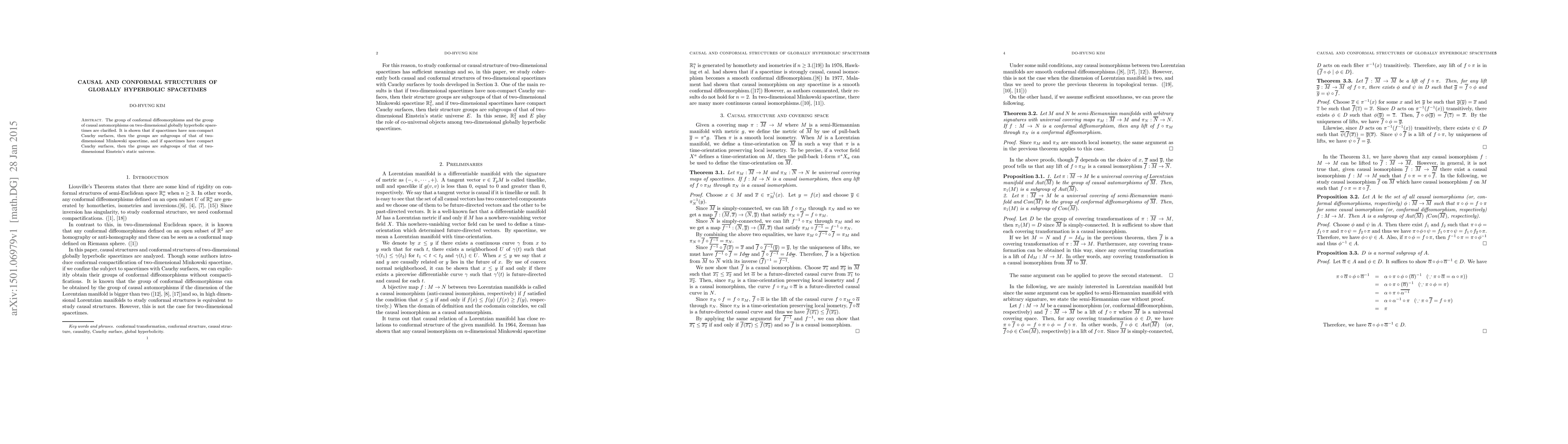This paper investigates the conformal and causal structures of two-dimensional globally hyperbolic spacetimes, demonstrating that their automorphism groups are subgroups of those in Minkowski spacetime if non-compact Cauchy surfaces are present, and subgroups of Einstein's static universe if compact Cauchy surfaces are present.