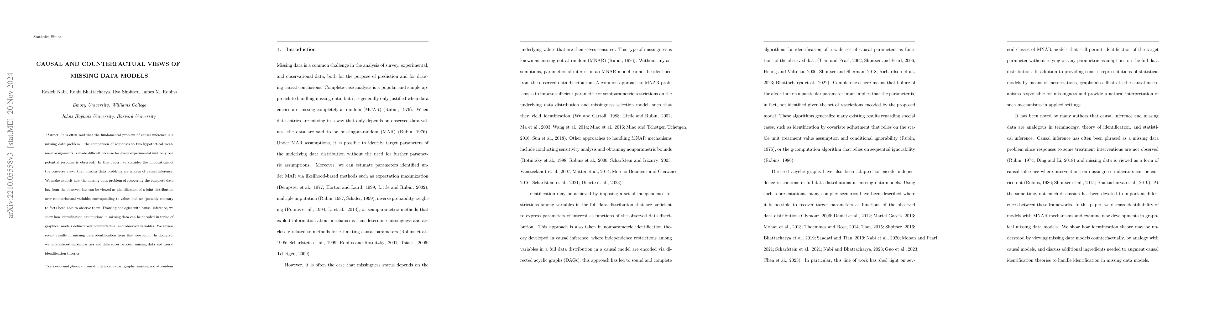 This paper explores the relationship between missing data problems and causal inference, arguing that missing data can be viewed as a form of causal inference. It demonstrates how identification assumptions in missing data can be framed using graphical models over counterfactual and observed variables, highlighting similarities and differences with causal identification theories.