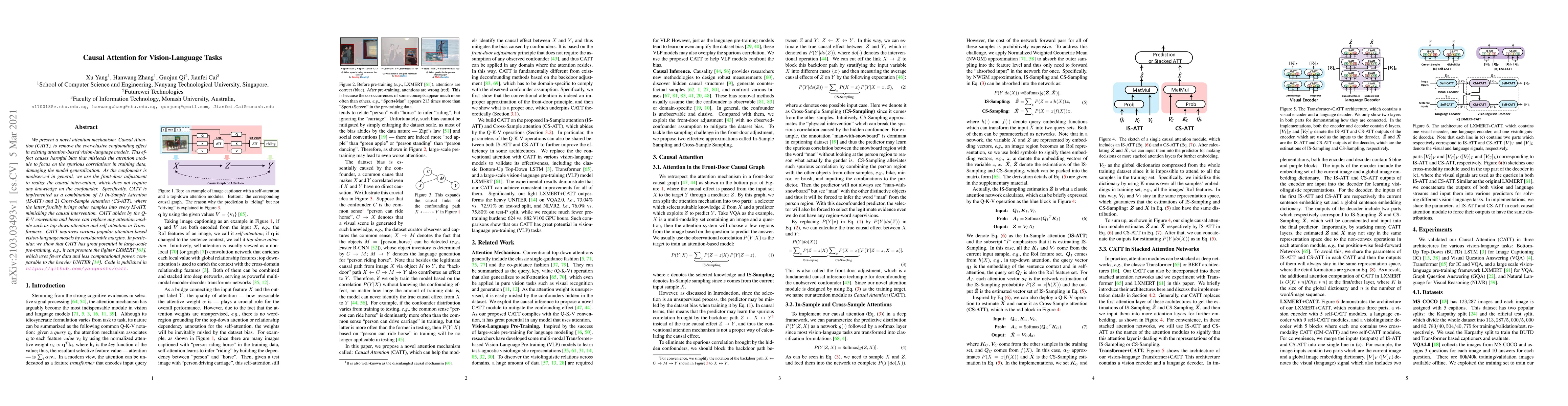 The paper introduces Causal Attention (CATT), a novel attention mechanism designed to mitigate confounding effects in vision-language models, thereby improving generalization and performance. CATT combines In-Sample and Cross-Sample Attention to simulate causal intervention without requiring knowledge of confounders, and it significantly enhances various attention-based models, including lightweight pre-training approaches.
