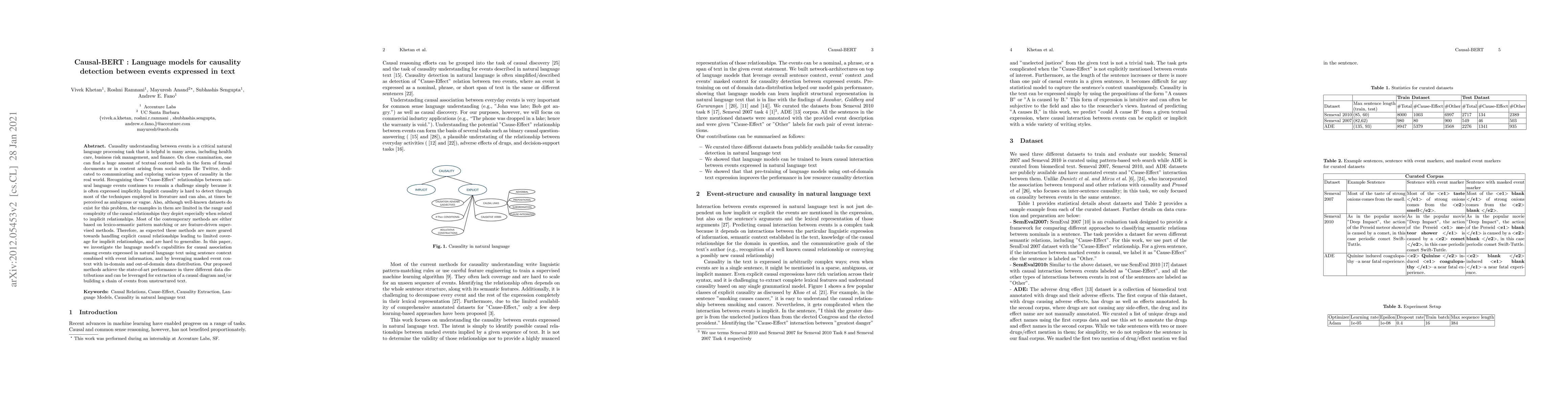 Causality understanding between events is a critical natural language processing task that is helpful in many areas, including health care, business risk management and finance. On close examination, one can find a huge amount of textual content both in the form of formal documents or in content arising from social media like Twitter, dedicated to communicating and exploring various types of causality in the real world. Recognizing these "Cause-Effect" relationships between natural language events continues to remain a challenge simply because it is often expressed implicitly. Implicit causality is hard to detect through most of the techniques employed in literature and can also, at times be perceived as ambiguous or vague. Also, although well-known datasets do exist for this problem, the examples in them are limited in the range and complexity of the causal relationships they depict especially when related to implicit relationships. Most of the contemporary methods are either based on lexico-semantic pattern matching or are feature-driven supervised methods. Therefore, as expected these methods are more geared towards handling explicit causal relationships leading to limited coverage for implicit relationships and are hard to generalize. In this paper, we investigate the language model's capabilities for causal association among events expressed in natural language text using sentence context combined with event information, and by leveraging masked event context with in-domain and out-of-domain data distribution. Our proposed methods achieve the state-of-art performance in three different data distributions and can be leveraged for extraction of a causal diagram and/or building a chain of events from unstructured text.