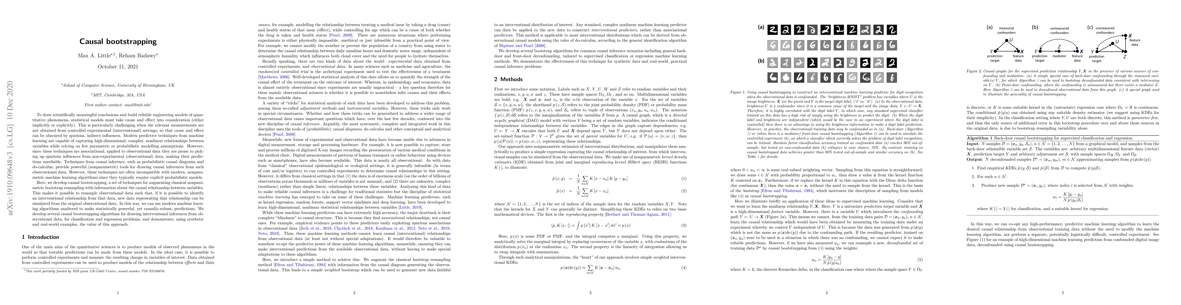 To draw scientifically meaningful conclusions and build reliable models of quantitative phenomena, cause and effect must be taken into consideration (either implicitly or explicitly). This is particularly challenging when the measurements are not from controlled experimental (interventional) settings, since cause and effect can be obscured by spurious, indirect influences. Modern predictive techniques from machine learning are capable of capturing high-dimensional, nonlinear relationships between variables while relying on few parametric or probabilistic model assumptions. However, since these techniques are associational, applied to observational data they are prone to picking up spurious influences from non-experimental (observational) data, making their predictions unreliable. Techniques from causal inference, such as probabilistic causal diagrams and do-calculus, provide powerful (nonparametric) tools for drawing causal inferences from such observational data. However, these techniques are often incompatible with modern, nonparametric machine learning algorithms since they typically require explicit probabilistic models. Here, we develop causal bootstrapping for augmenting classical nonparametric bootstrap resampling with information on the causal relationship between variables. This makes it possible to resample observational data such that, if it is possible to identify an interventional relationship from that data, new data representing that relationship can be simulated from the original observational data. In this way, we can use modern machine learning algorithms unaltered to make statistically powerful, yet causally-robust, predictions. We develop several causal bootstrapping algorithms for drawing interventional inferences from observational data, for classification and regression problems, and demonstrate, using synthetic and real-world examples, the value of this approach.