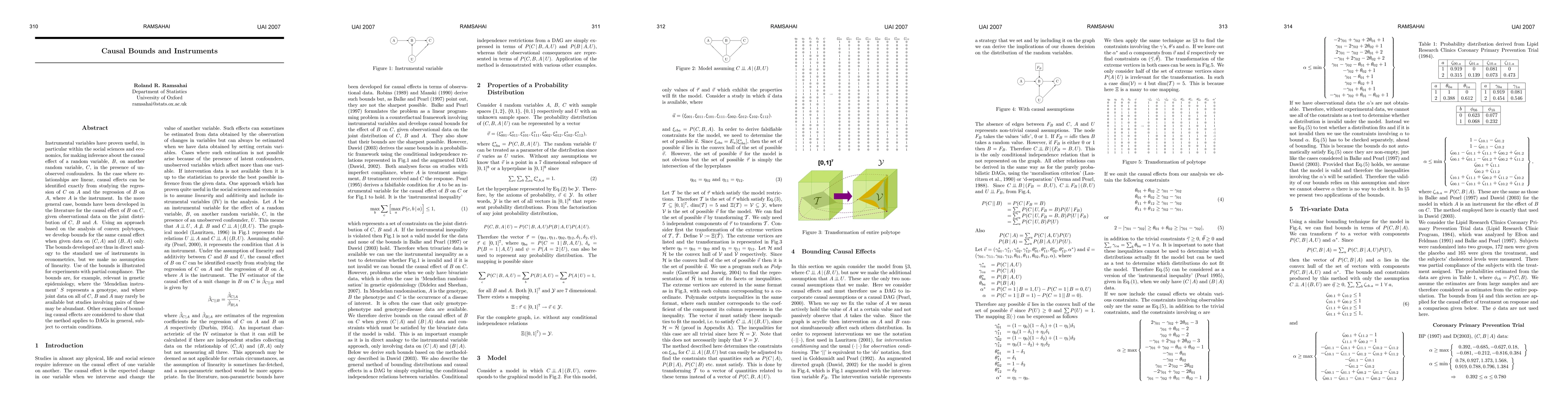 Instrumental variables have proven useful, in particular within the social sciences and economics, for making inference about the causal effect of a random variable, B, on another random variable, C, in the presence of unobserved confounders. In the case where relationships are linear, causal effects can be identified exactly from studying the regression of C on A and the regression of B on A, where A is the instrument. In the more general case, bounds have been developed in the literature for the causal effect of B on C, given observational data on the joint distribution of C, B and A. Using an approach based on the analysis of convex polytopes, we develop bounds for the same causal effect when given data on (C,A) and (B,A) only. The bounds developed are thus in direct analogy to the standard use of instruments in econometrics, but we make no assumption of linearity. Use of the bounds is illustrated for experiments with partial compliance. The bounds are, for example, relevant in genetic epidemiology, where the 'Mendelian instrument' S represents a genotype, and where joint data on all of C, B and A may rarely be available but studies involving pairs of these may be abundant. Other examples of bounding causal effects are considered to show that the method applies to DAGs in general, subject to certain conditions.