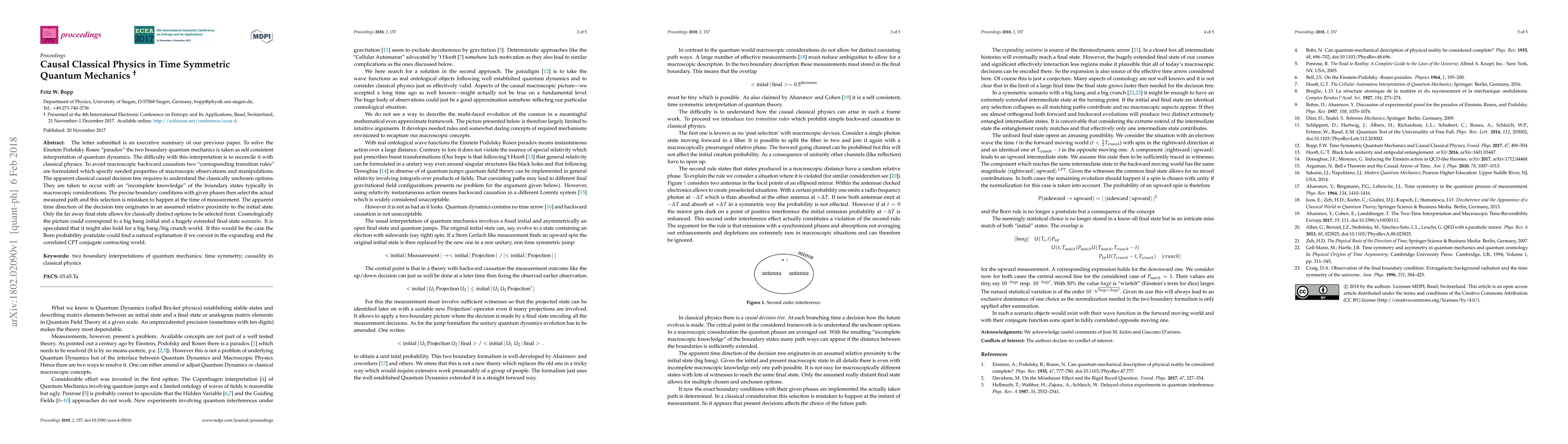 The letter submitted is an executive summary of our previous paper. To solve the Einstein Podolsky Rosen 'paradox' the two boundary quantum mechanics is taken as self consistent interpretation of quantum dynamics. The difficulty with this interpretation is to reconcile it with classical physics. To avoid macroscopic backward causation two 'corresponding transition rules' are formulated which specify needed properties of macroscopic observations and manipulations. The apparent classical causal decision tree requires to understand the classically unchosen options. They are taken to occur with an 'incomplete knowledge' of the boundary states typically in macroscopic considerations. The precise boundary conditions with given phases then select the actual measured path and this selection is mistaken to happen at the time of measurement. The apparent time direction of the decision tree originates in an assumed relative proximity to the initial state. Only the far away final state allows for classically distinct options to be selected from. Cosmologically the picture could correspond to a big bang initial and a hugely extended final state scenario. It is speculated that it might also hold for a big bang/big crunch world. If this would be the case the Born probability postulate could find a natural explanation if we coexist in the expanding and the correlated CPT conjugate contracting world.