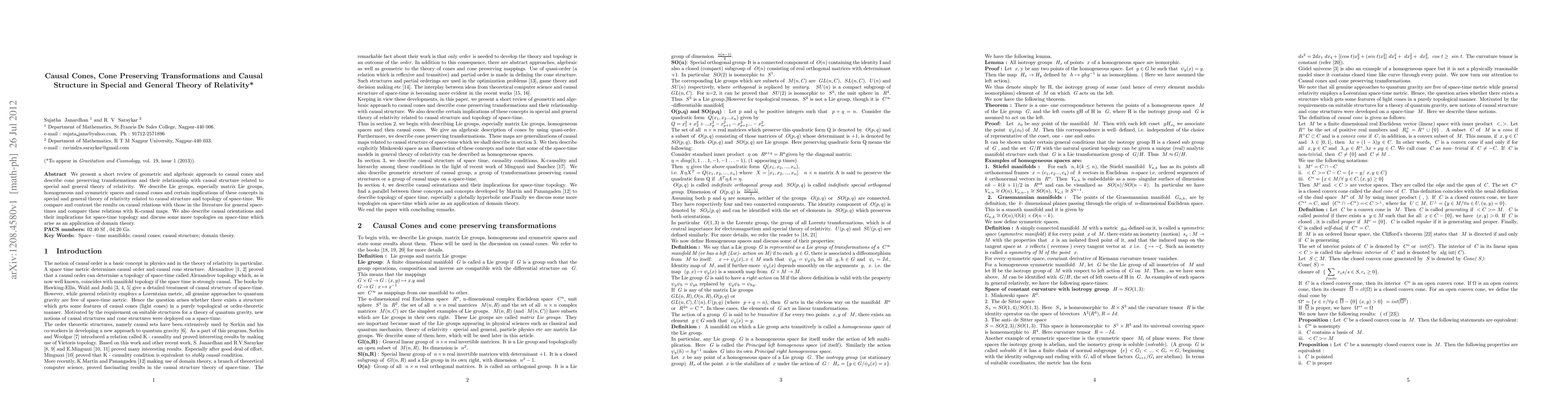 This paper reviews geometric and algebraic methods for causal cones in relativity, focusing on cone preserving transformations and their implications for causal structure in special and general relativity. It explores Lie groups, homogeneous and symmetric spaces, and their role in space-time topology, comparing these findings with existing literature and K-causal maps.