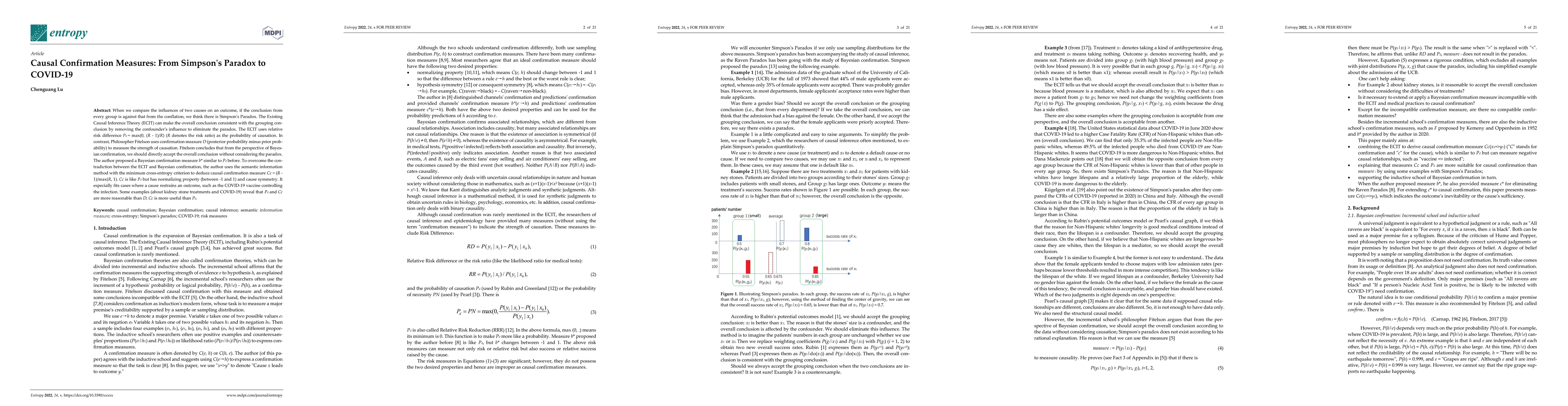 When we compare the influences of two causes on an outcome, if the conclusion from every group is against that from the conflation, we think there is Simpson's Paradox. The Existing Causal Inference Theory (ECIT) can make the overall conclusion consistent with the grouping conclusion by removing the confounder's influence to eliminate the paradox. The ECIT uses relative risk difference Pd = max(0, (R - 1)/R) (R denotes the risk ratio) as the probability of causation. In contrast, Philosopher Fitelson uses confirmation measure D (posterior probability minus prior probability) to measure the strength of causation. Fitelson concludes that from the perspective of Bayesian confirmation, we should directly accept the overall conclusion without considering the paradox. The author proposed a Bayesian confirmation measure b* similar to Pd before. To overcome the contradiction between the ECIT and Bayesian confirmation, the author uses the semantic information method with the minimum cross-entropy criterion to deduce causal confirmation measure Cc = (R -1)/max(R, 1). Cc is like Pd but has normalizing property (between -1 and 1) and cause symmetry. It especially fits cases where a cause restrains an outcome, such as the COVID-19 vaccine controlling the infection. Some examples (about kidney stone treatments and COVID-19) reveal that Pd and Cc are more reasonable than D; Cc is more useful than Pd.