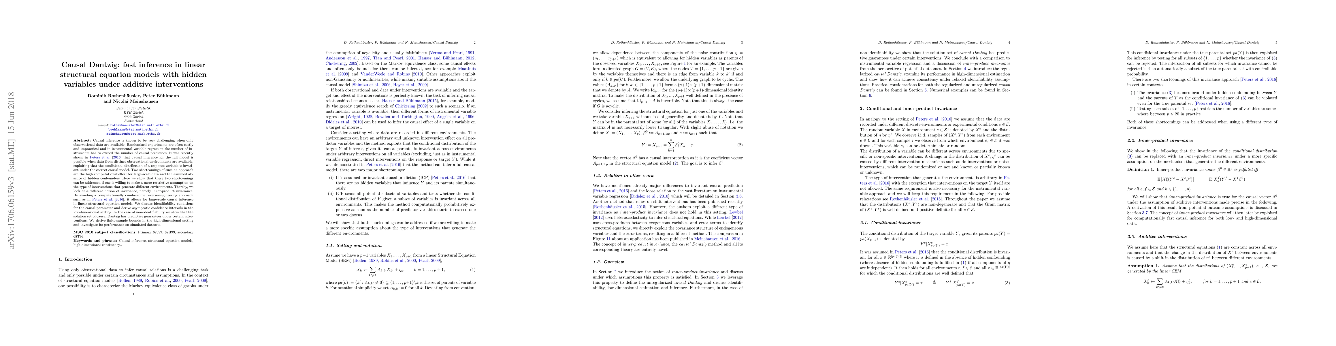 This paper proposes Causal Dantzig, a method for fast causal inference in linear structural equation models with hidden variables under additive interventions, addressing computational challenges and hidden confounders by leveraging inner-product invariance instead of reverse-engineering. It provides identifiability conditions and asymptotic confidence intervals for causal parameters.