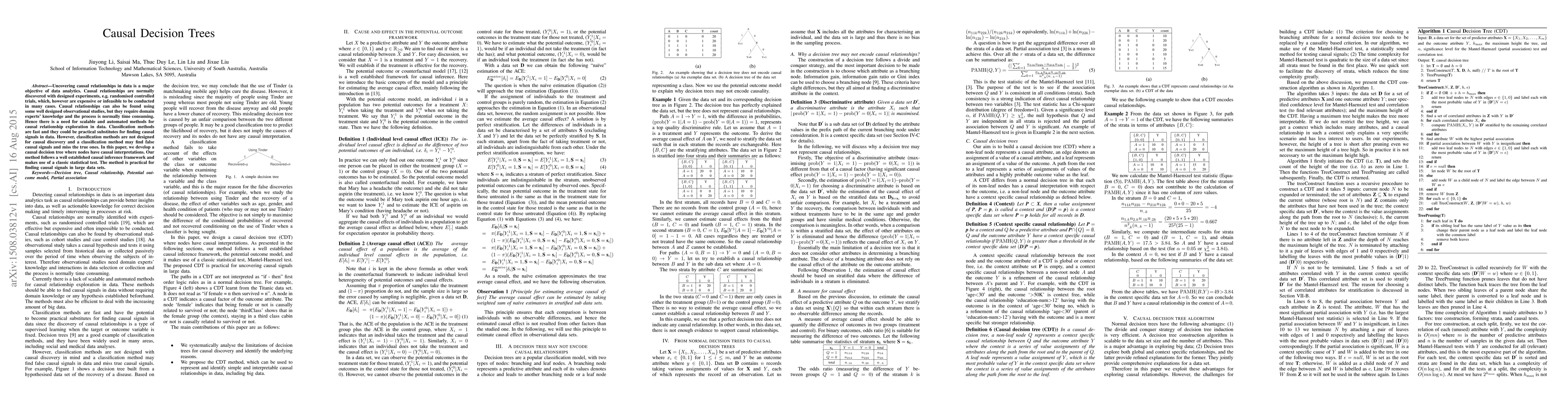 Uncovering causal relationships in data is a major objective of data analytics. Causal relationships are normally discovered with designed experiments, e.g. randomised controlled trials, which, however are expensive or infeasible to be conducted in many cases. Causal relationships can also be found using some well designed observational studies, but they require domain experts' knowledge and the process is normally time consuming. Hence there is a need for scalable and automated methods for causal relationship exploration in data. Classification methods are fast and they could be practical substitutes for finding causal signals in data. However, classification methods are not designed for causal discovery and a classification method may find false causal signals and miss the true ones. In this paper, we develop a causal decision tree where nodes have causal interpretations. Our method follows a well established causal inference framework and makes use of a classic statistical test. The method is practical for finding causal signals in large data sets.
