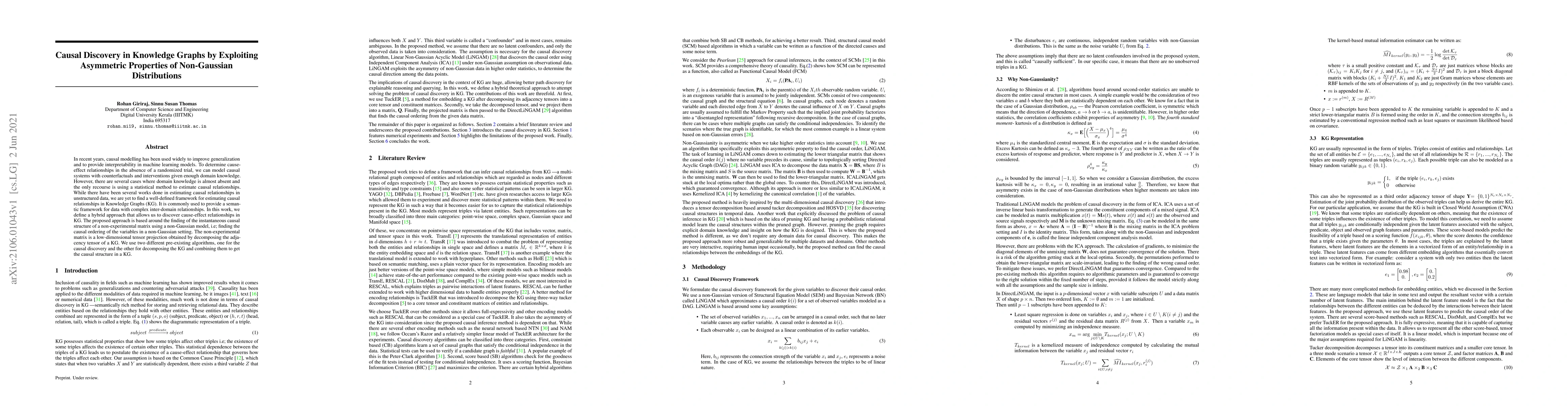 In recent years, causal modelling has been used widely to improve generalization and to provide interpretability in machine learning models. To determine cause-effect relationships in the absence of a randomized trial, we can model causal systems with counterfactuals and interventions given enough domain knowledge. However, there are several cases where domain knowledge is almost absent and the only recourse is using a statistical method to estimate causal relationships. While there have been several works done in estimating causal relationships in unstructured data, we are yet to find a well-defined framework for estimating causal relationships in Knowledge Graphs (KG). It is commonly used to provide a semantic framework for data with complex inter-domain relationships. In this work, we define a hybrid approach that allows us to discover cause-effect relationships in KG. The proposed approach is based around the finding of the instantaneous causal structure of a non-experimental matrix using a non-Gaussian model, i.e; finding the causal ordering of the variables in a non-Gaussian setting. The non-experimental matrix is a low-dimensional tensor projection obtained by decomposing the adjacency tensor of a KG. We use two different pre-existing algorithms, one for the causal discovery and the other for decomposing the KG and combining them to get the causal structure in a KG.