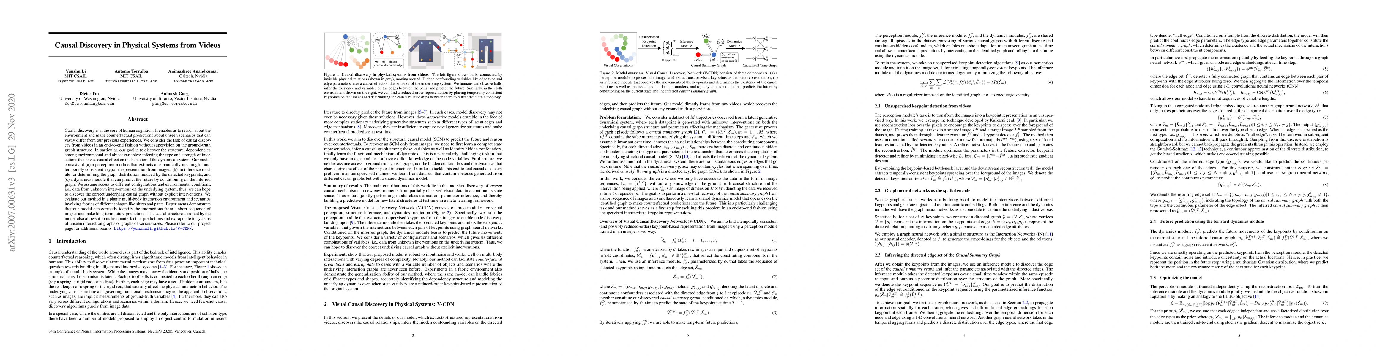 Causal discovery is at the core of human cognition. It enables us to reason about the environment and make counterfactual predictions about unseen scenarios that can vastly differ from our previous experiences. We consider the task of causal discovery from videos in an end-to-end fashion without supervision on the ground-truth graph structure. In particular, our goal is to discover the structural dependencies among environmental and object variables: inferring the type and strength of interactions that have a causal effect on the behavior of the dynamical system. Our model consists of (a) a perception module that extracts a semantically meaningful and temporally consistent keypoint representation from images, (b) an inference module for determining the graph distribution induced by the detected keypoints, and (c) a dynamics module that can predict the future by conditioning on the inferred graph. We assume access to different configurations and environmental conditions, i.e., data from unknown interventions on the underlying system; thus, we can hope to discover the correct underlying causal graph without explicit interventions. We evaluate our method in a planar multi-body interaction environment and scenarios involving fabrics of different shapes like shirts and pants. Experiments demonstrate that our model can correctly identify the interactions from a short sequence of images and make long-term future predictions. The causal structure assumed by the model also allows it to make counterfactual predictions and extrapolate to systems of unseen interaction graphs or graphs of various sizes.