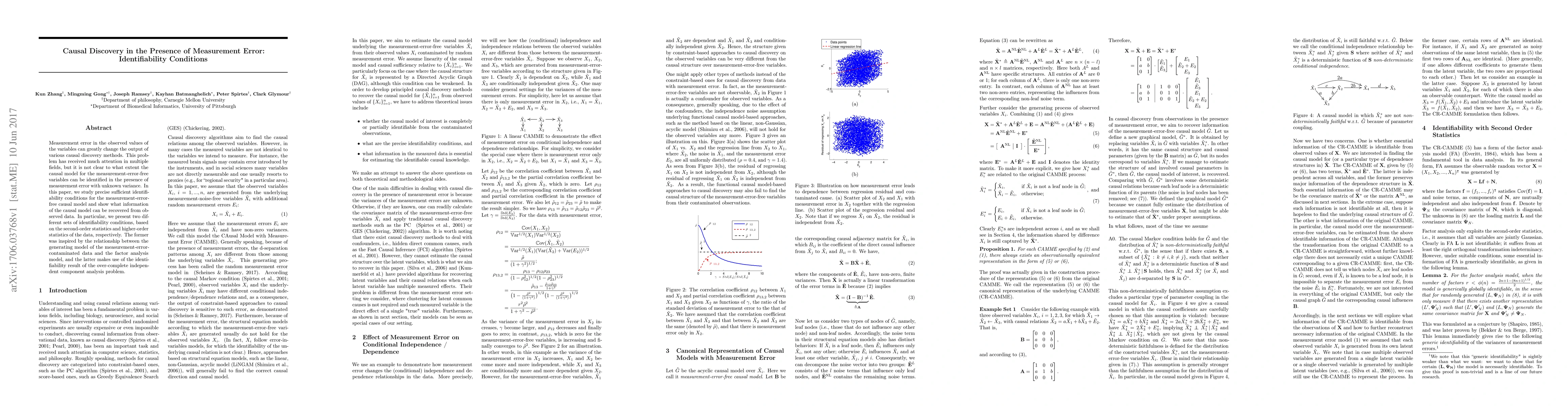 This paper investigates the identifiability of causal models when measurement error is present, providing sufficient conditions based on second-order and higher-order statistics. It reveals what aspects of the true causal model can be recovered from data contaminated by unknown measurement error variances.