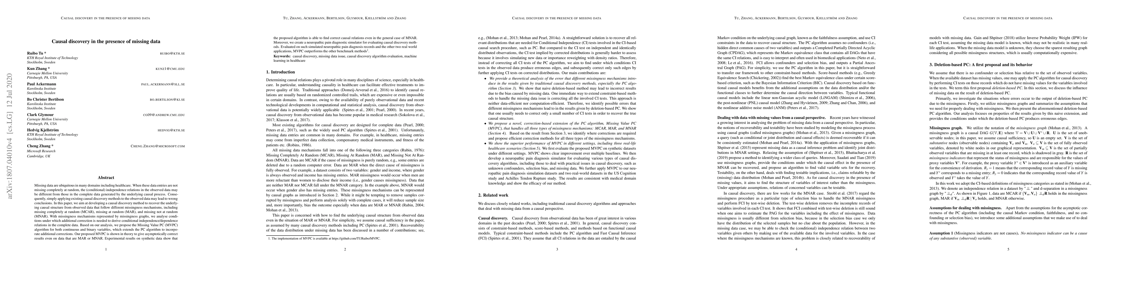 Missing data are ubiquitous in many domains including healthcare. When these data entries are not missing completely at random, the (conditional) independence relations in the observed data may be different from those in the complete data generated by the underlying causal process. Consequently, simply applying existing causal discovery methods to the observed data may lead to wrong conclusions. In this paper, we aim at developing a causal discovery method to recover the underlying causal structure from observed data that follow different missingness mechanisms, including missing completely at random (MCAR), missing at random (MAR), and missing not at random (MNAR). With missingness mechanisms represented by missingness graphs, we analyse conditions under which additional correction is needed to derive conditional independence/dependence relations in the complete data. Based on our analysis, we propose the Missing Value PC (MVPC) algorithm for both continuous and binary variables, which extends the PC algorithm to incorporate additional corrections. Our proposed MVPC is shown in theory to give asymptotically correct results even on data that are MAR or MNAR. Experimental results on synthetic data show that the proposed algorithm is able to find correct causal relations even in the general case of MNAR. Moreover, we create a neuropathic pain diagnostic simulator for evaluating causal discovery methods. Evaluated on such simulated neuropathic pain diagnosis records and the other two real world applications, MVPC outperforms the other benchmark methods.