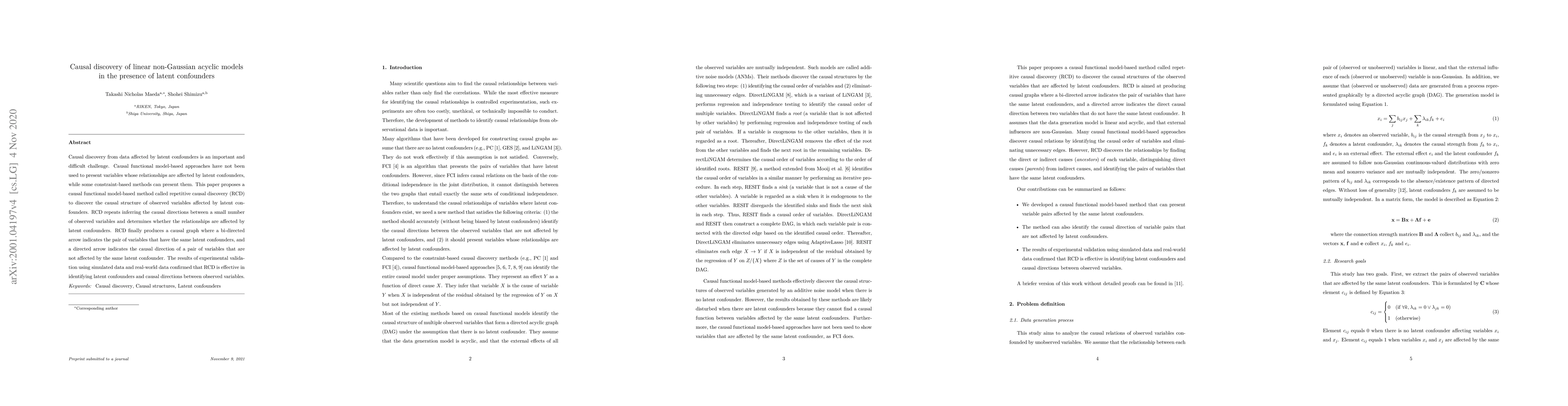 Causal discovery from data affected by latent confounders is an important and difficult challenge. Causal functional model-based approaches have not been used to present variables whose relationships are affected by latent confounders, while some constraint-based methods can present them. This paper proposes a causal functional model-based method called repetitive causal discovery (RCD) to discover the causal structure of observed variables affected by latent confounders. RCD repeats inferring the causal directions between a small number of observed variables and determines whether the relationships are affected by latent confounders. RCD finally produces a causal graph where a bi-directed arrow indicates the pair of variables that have the same latent confounders, and a directed arrow indicates the causal direction of a pair of variables that are not affected by the same latent confounder. The results of experimental validation using simulated data and real-world data confirmed that RCD is effective in identifying latent confounders and causal directions between observed variables.