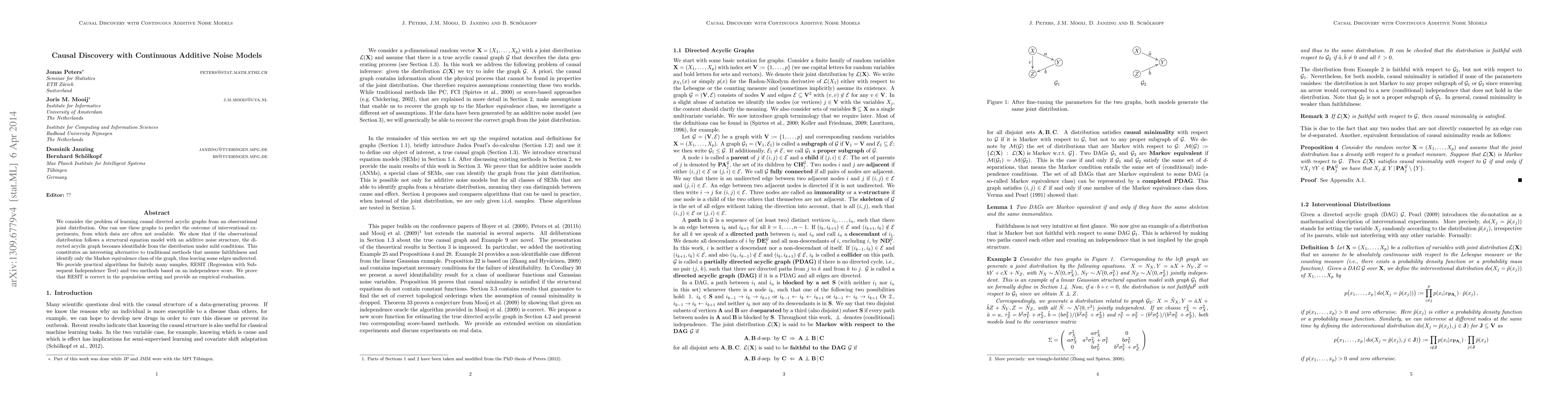 We consider the problem of learning causal directed acyclic graphs from an observational joint distribution. One can use these graphs to predict the outcome of interventional experiments, from which data are often not available. We show that if the observational distribution follows a structural equation model with an additive noise structure, the directed acyclic graph becomes identifiable from the distribution under mild conditions. This constitutes an interesting alternative to traditional methods that assume faithfulness and identify only the Markov equivalence class of the graph, thus leaving some edges undirected. We provide practical algorithms for finitely many samples, RESIT (Regression with Subsequent Independence Test) and two methods based on an independence score. We prove that RESIT is correct in the population setting and provide an empirical evaluation.