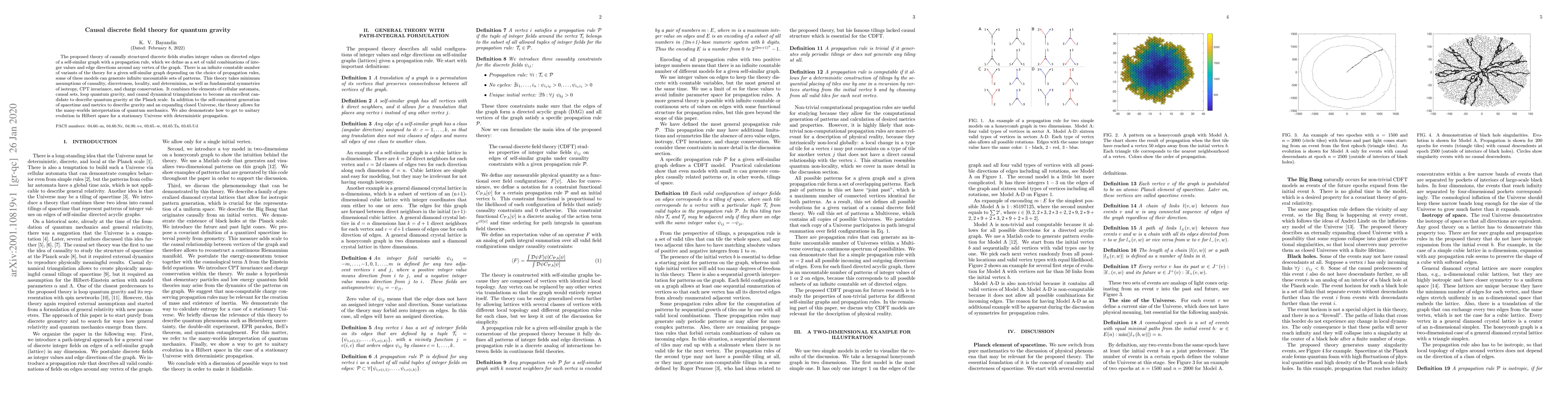 The proposed theory of causally structured discrete fields studies integer values on directed edges of a self-similar graph with a propagation rule, which we define as a set of valid combinations of integer values and edge directions around any vertex of the graph. There is an infinite countable number of variants of the theory for a given self-similar graph depending on the choice of propagation rules, some of these models can generate infinite uncountable sets of patterns. This theory takes minimum assumptions of causality, discreteness, locality, and determinism, as well as fundamental symmetries of isotropy, CPT invariance, and charge conservation. It combines the elements of cellular automata, causal sets, loop quantum gravity, and causal dynamical triangulations to become an excellent candidate to describe quantum gravity at the Planck scale. In addition to the self-consistent generation of spacetime and metrics to describe gravity and an expanding closed Universe, the theory allows for the many-worlds interpretation of quantum mechanics. We also demonstrate how to get to unitary evolution in Hilbert space for a stationary Universe with deterministic propagation.