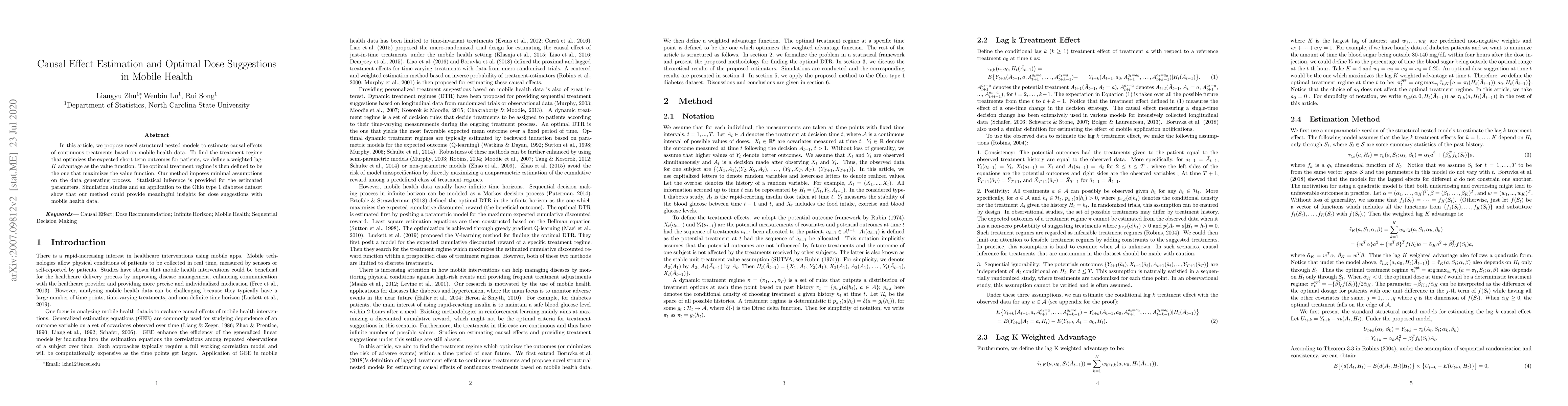 In this article, we propose novel structural nested models to estimate causal effects of continuous treatments based on mobile health data. To find the treatment regime that optimizes the expected short-term outcomes for patients, we define a weighted lag-K advantage as the value function. The optimal treatment regime is then defined to be the one that maximizes the value function. Our method imposes minimal assumptions on the data generating process. Statistical inference is provided for the estimated parameters. Simulation studies and an application to the Ohio type 1 diabetes dataset show that our method could provide meaningful insights for dose suggestions with mobile health data.
