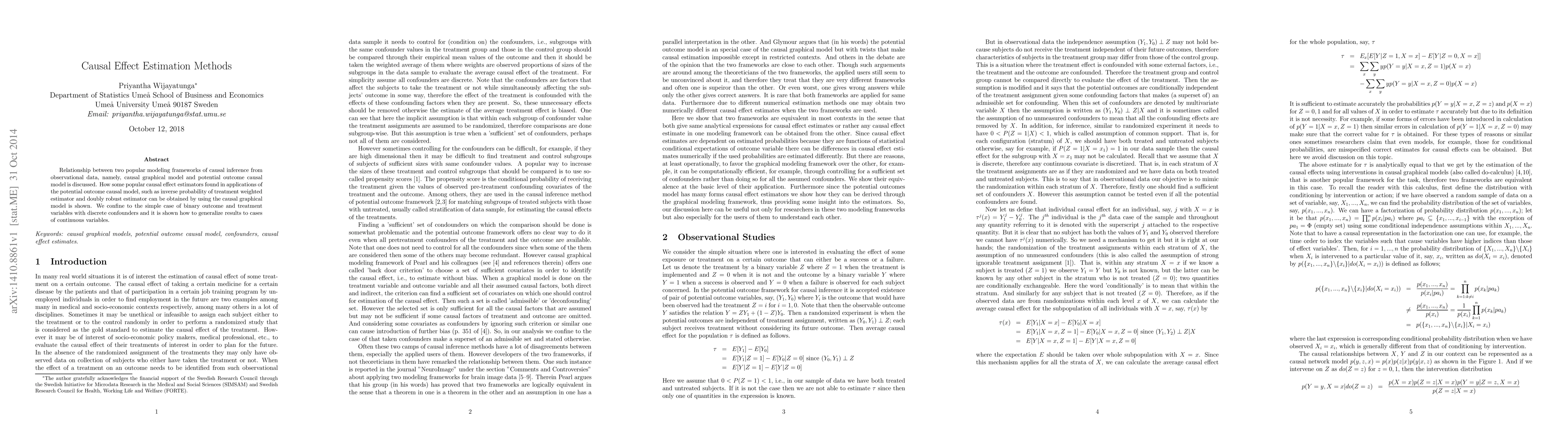 Relationship between two popular modeling frameworks of causal inference from observational data, namely, causal graphical model and potential outcome causal model is discussed. How some popular causal effect estimators found in applications of the potential outcome causal model, such as inverse probability of treatment weighted estimator and doubly robust estimator can be obtained by using the causal graphical model is shown. We confine to the simple case of binary outcome and treatment variables with discrete confounders and it is shown how to generalize results to cases of continuous variables.
