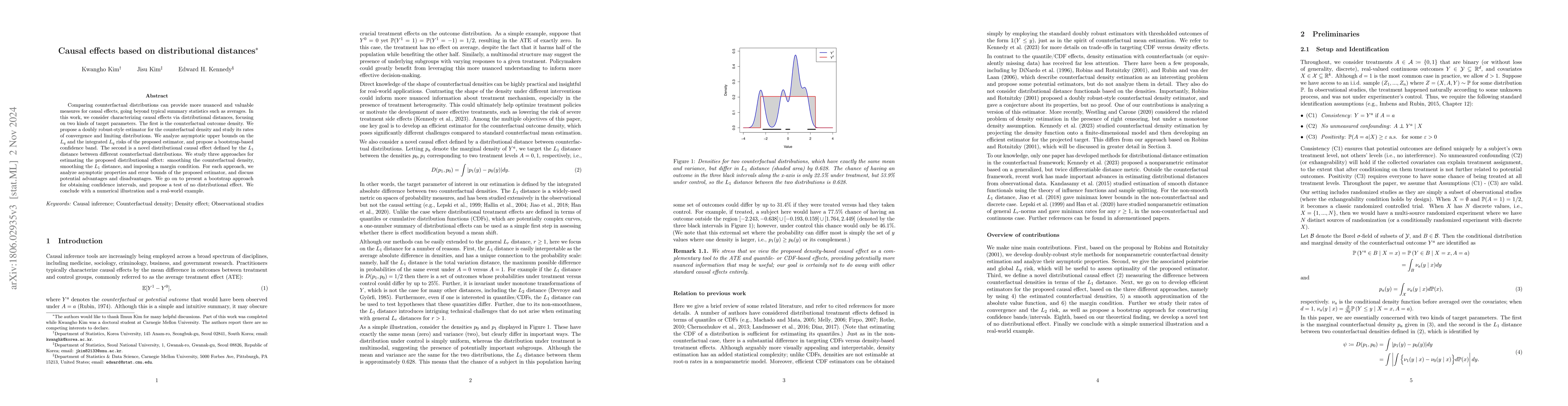In this paper we develop a framework for characterizing causal effects via distributional distances. In particular we define a causal effect in terms of the $L_1$ distance between different counterfactual outcome distributions, rather than the typical mean difference in outcome values. Comparing entire counterfactual outcome distributions can provide more nuanced and valuable measures for exploring causal effects beyond the average treatment effect. First, we propose a novel way to estimate counterfactual outcome densities, which is of independent interest. Then we develop an efficient estimator of our target causal effect. We go on to provide error bounds and asymptotic properties of the proposed estimator, along with bootstrap-based confidence intervals. Finally, we illustrate the methods via simulations and real data.