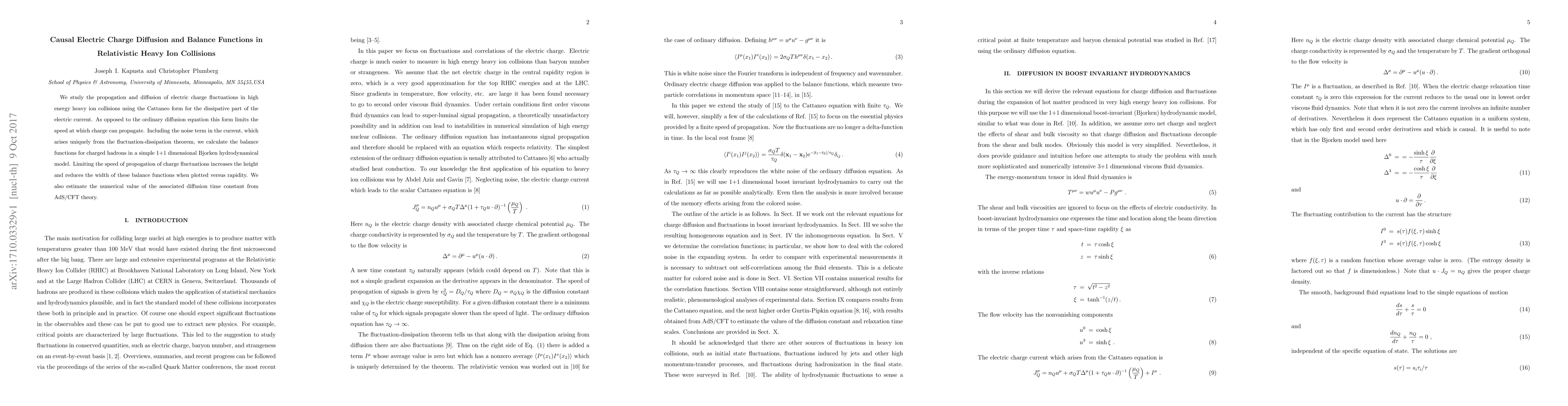 The paper introduces the Cattaneo form for electric current, which includes finite propagation speed and a noise term, addressing issues with instantaneous propagation in traditional diffusion models. It calculates balance functions for charged hadrons in a simplified hydrodynamical model, demonstrating the effects of limiting charge propagation speed.