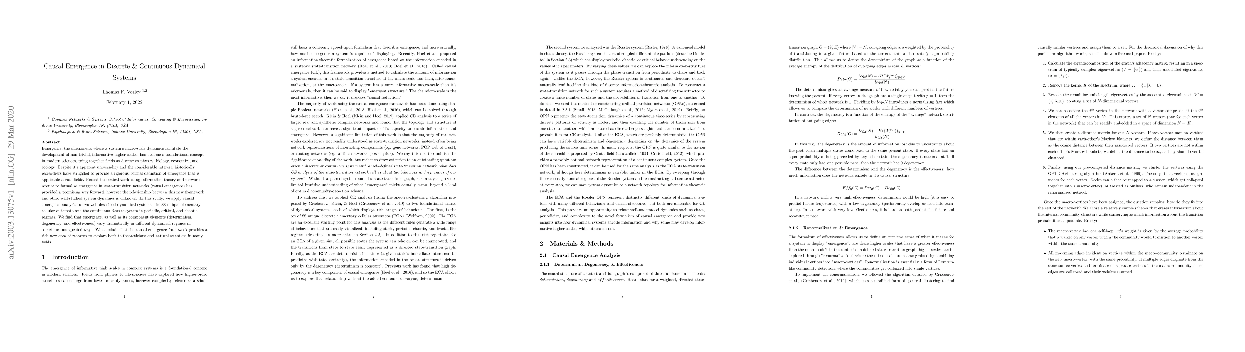 Emergence, the phenomena where a system's micro-scale dynamics facilitate the development of non-trivial, informative higher scales, has become a foundational concept in modern sciences, tying together fields as diverse as physics, biology, economics, and ecology. Despite it's apparent universality and the considerable interest, historically researchers have struggled to provide a rigorous, formal definition of emergence that is applicable across fields. Recent theoretical work using information theory and network science to formalize emergence in state-transition networks (causal emergence) has provided a promising way forward, however the relationship between this new framework and other well-studied system dynamics is unknown. In this study, we apply causal emergence analysis to two well-described dynamical systems: the 88 unique elementary cellular automata and the continuous Rossler system in periodic, critical, and chaotic regimes. We find that emergence, as well as its component elements (determinism, degeneracy, and effectiveness) vary dramatically in different dynamical regimes in sometimes unexpected ways. We conclude that the causal emergence framework provides a rich new area of research to explore both to theoreticians and natural scientists in many fields.