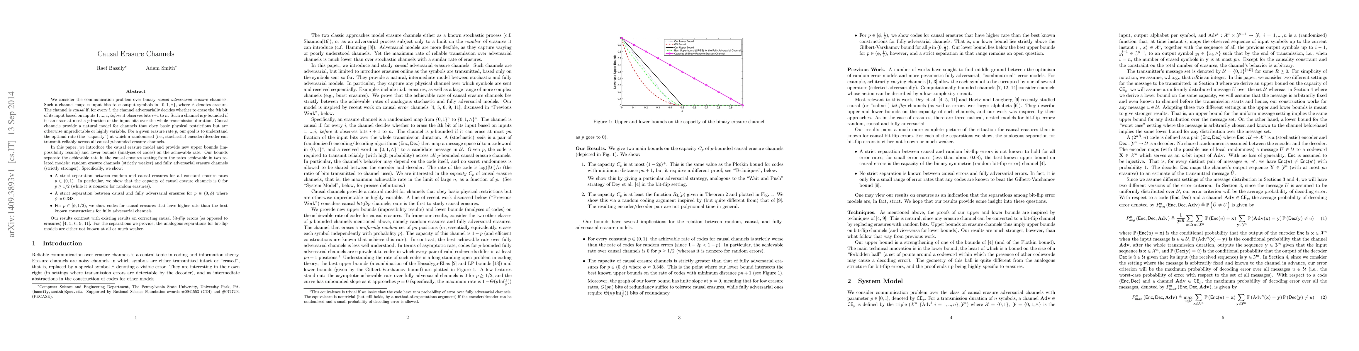 We consider the communication problem over binary causal adversarial erasure channels. Such a channel maps $n$ input bits to $n$ output symbols in $\{0,1,\wedge\}$, where $\wedge$ denotes erasure. The channel is causal if, for every $i$, the channel adversarially decides whether to erase the $i$th bit of its input based on inputs $1,...,i$, before it observes bits $i+1$ to $n$. Such a channel is $p$-bounded if it can erase at most a $p$ fraction of the input bits over the whole transmission duration. Causal channels provide a natural model for channels that obey basic physical restrictions but are otherwise unpredictable or highly variable. For a given erasure rate $p$, our goal is to understand the optimal rate (the capacity) at which a randomized (stochastic) encoder/decoder can transmit reliably across all causal $p$-bounded erasure channels. In this paper, we introduce the causal erasure model and provide new upper bounds and lower bounds on the achievable rate. Our bounds separate the achievable rate in the causal erasures setting from the rates achievable in two related models: random erasure channels (strictly weaker) and fully adversarial erasure channels (strictly stronger). Specifically, we show: - A strict separation between random and causal erasures for all constant erasure rates $p\in(0,1)$. - A strict separation between causal and fully adversarial erasures for $p\in(0,\phi)$ where $\phi \approx 0.348$. - For $p\in[\phi,1/2)$, we show codes for causal erasures that have higher rate than the best known constructions for fully adversarial channels. Our results contrast with existing results on correcting causal bit-flip errors (as opposed to erasures) [Dey et. al 2008, 2009], [Haviv-Langberg 2011]. For the separations we provide, the analogous separations for bit-flip models are either not known at all or much weaker.