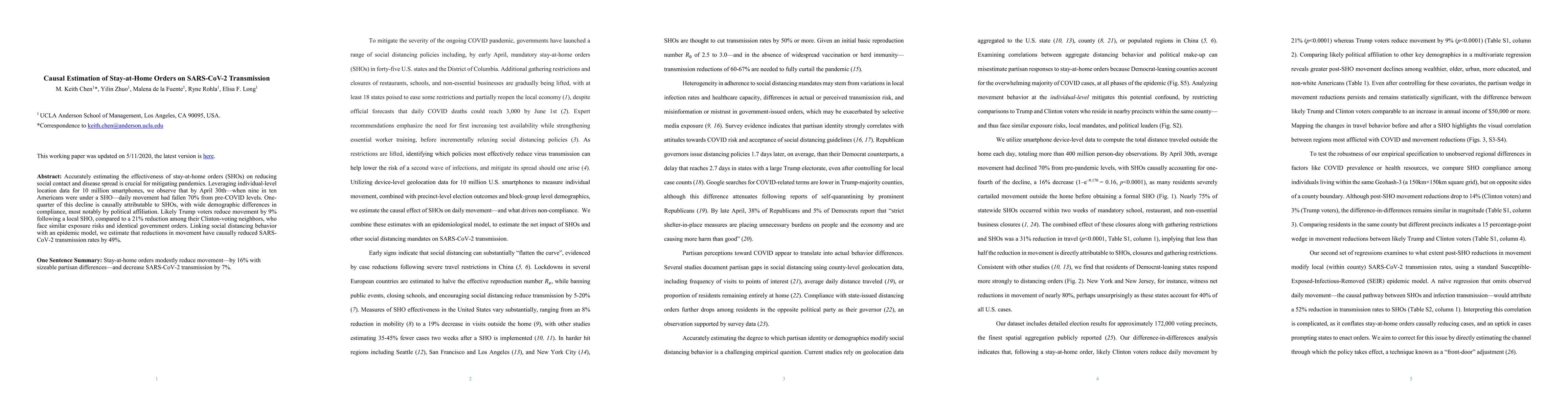 This study uses smartphone location data to estimate the impact of stay-at-home orders on reducing SARS-CoV-2 transmission, finding a 70% decline in daily movement by April 30th, with 25% of this reduction attributable to SHOs. Political affiliation significantly influences compliance, with Clinton voters reducing movement more than Trump voters, leading to an estimated 49% reduction in transmission rates.