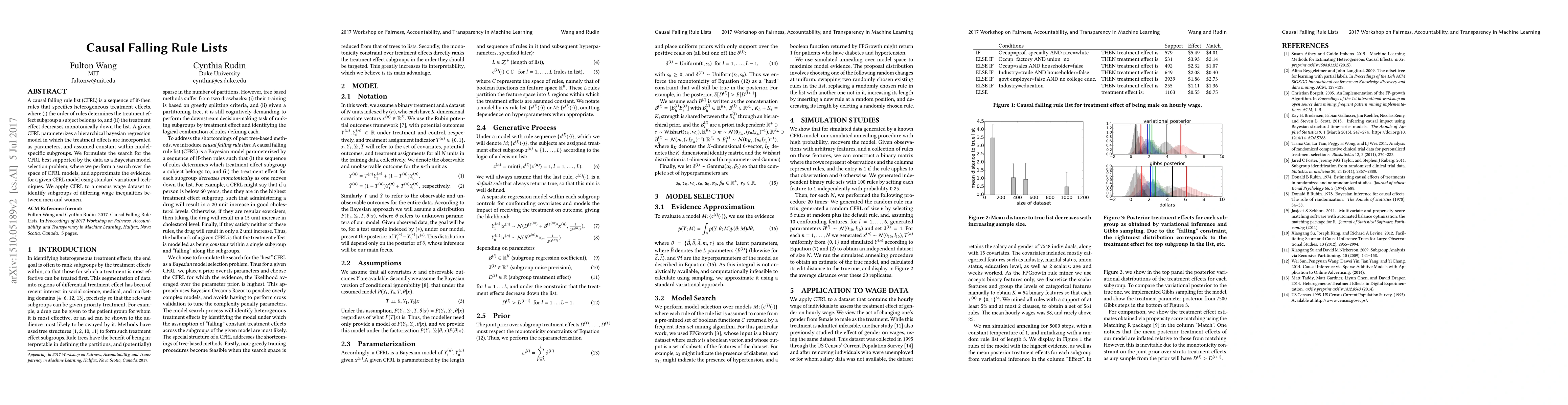 This paper introduces causal falling rule lists (CFRL) to model heterogeneous treatment effects, where the order of rules determines subgroup membership and treatment effects decrease monotonically. The authors use CFRL to parameterize a hierarchical Bayesian regression model and apply it to a census wage dataset to identify wage inequality differences between men and women.