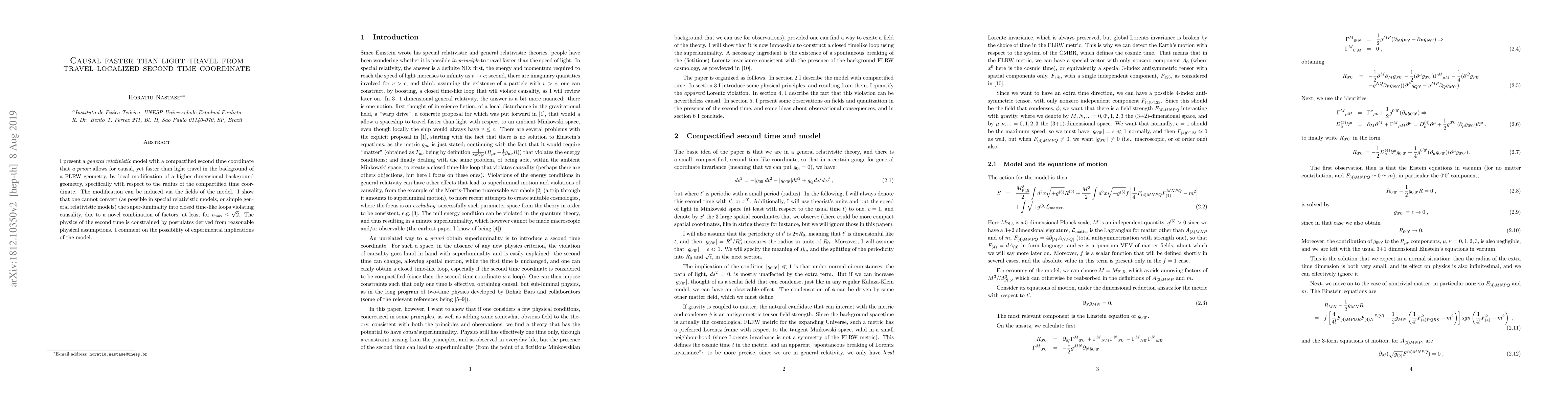 This paper proposes a general relativistic model with a compactified second time coordinate that enables causal faster-than-light travel within a FLRW geometry, without forming closed time-like loops. The model's unique constraints prevent super-luminality from violating causality, and it discusses potential experimental implications.