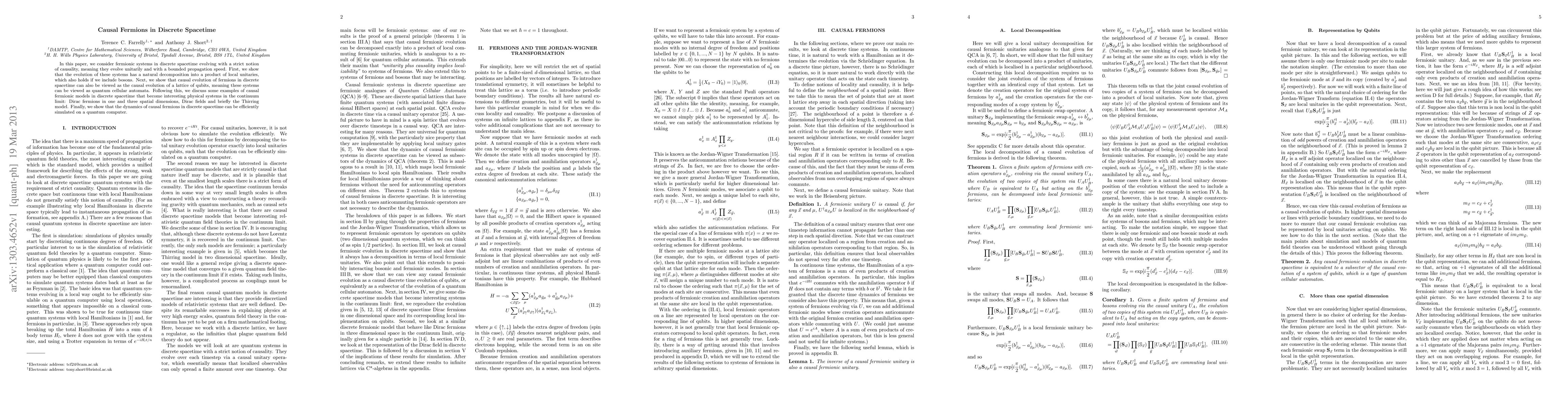 This paper explores fermionic systems in discrete spacetime with a strict causal evolution, demonstrating their decomposition into local unitaries and their equivalence to quantum cellular automata. It also discusses the continuum limit relevance of Dirac fermions and the feasibility of simulating these dynamics on a quantum computer.