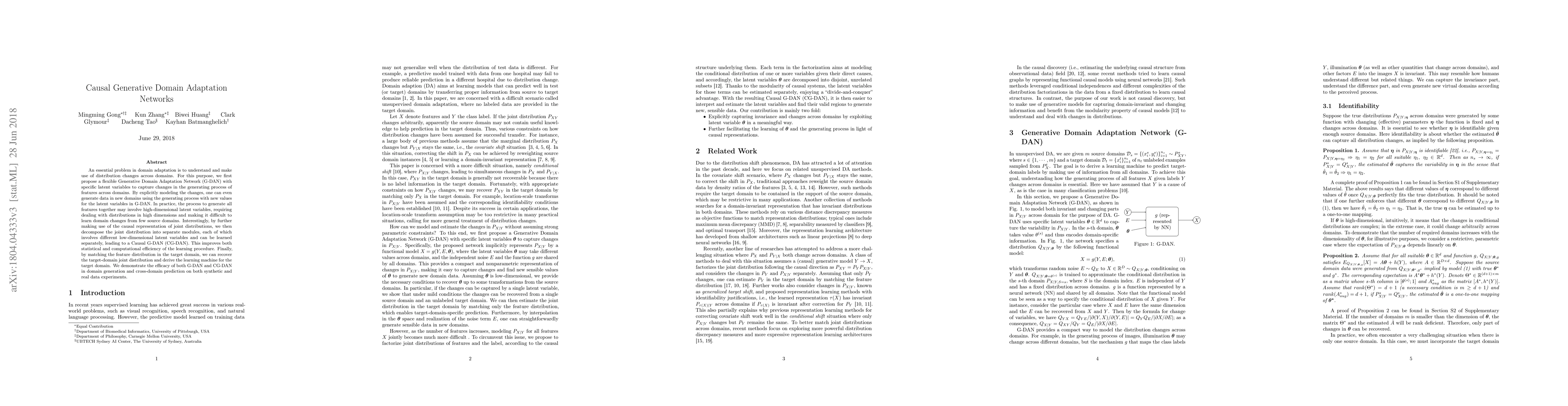 This paper proposes Generative Domain Adaptation Networks (G-DAN) to capture distribution changes across domains, and introduces a Causal G-DAN (CG-DAN) that decomposes the joint distribution into low-dimensional latent variables for improved efficiency and effectiveness in domain adaptation tasks.