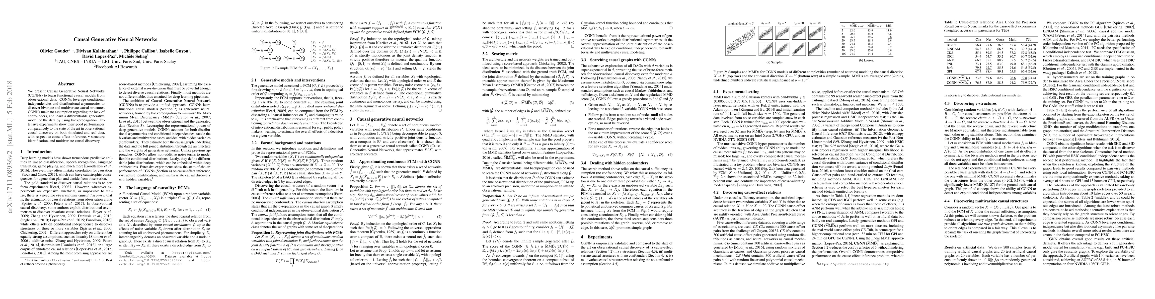 We present Causal Generative Neural Networks (CGNNs) to learn functional causal models from observational data. CGNNs leverage conditional independencies and distributional asymmetries to discover bivariate and multivariate causal structures. CGNNs make no assumption regarding the lack of confounders, and learn a differentiable generative model of the data by using backpropagation. Extensive experiments show their good performances comparatively to the state of the art in observational causal discovery on both simulated and real data, with respect to cause-effect inference, v-structure identification, and multivariate causal discovery.