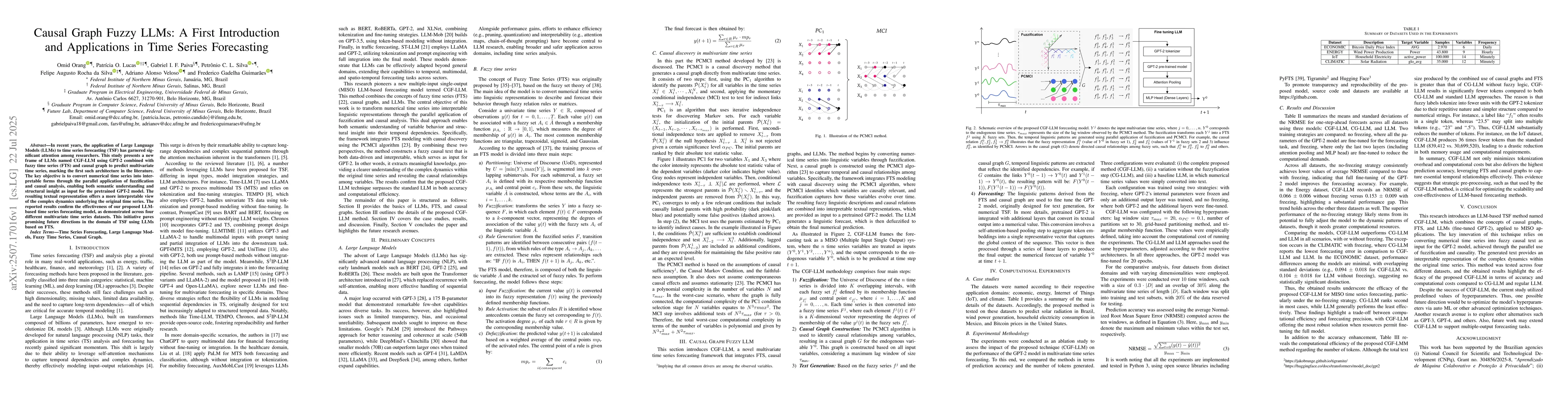 In recent years, the application of Large Language Models (LLMs) to time series forecasting (TSF) has garnered significant attention among researchers. This study presents a new frame of LLMs named CGF-LLM using GPT-2 combined with fuzzy time series (FTS) and causal graph to predict multivariate time series, marking the first such architecture in the literature. The key objective is to convert numerical time series into interpretable forms through the parallel application of fuzzification and causal analysis, enabling both semantic understanding and structural insight as input for the pretrained GPT-2 model. The resulting textual representation offers a more interpretable view of the complex dynamics underlying the original time series. The reported results confirm the effectiveness of our proposed LLM-based time series forecasting model, as demonstrated across four different multivariate time series datasets. This initiative paves promising future directions in the domain of TSF using LLMs based on FTS.