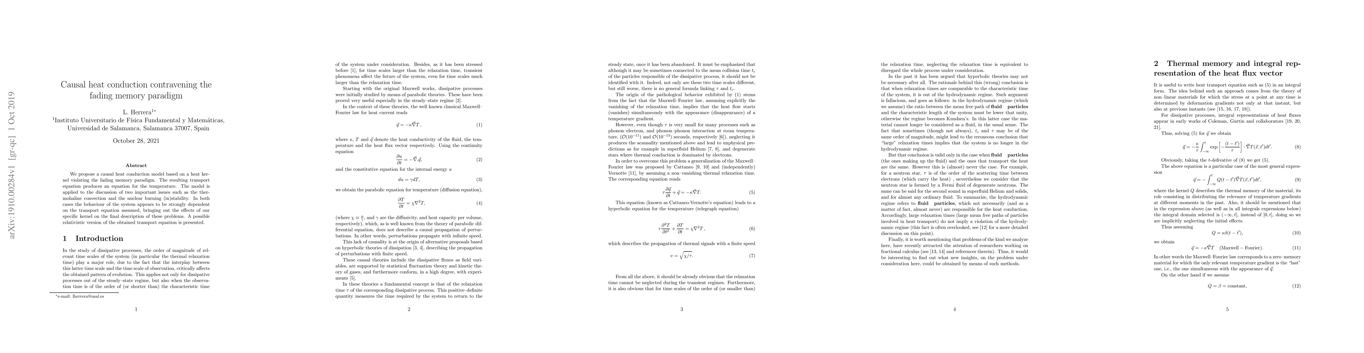 This paper proposes a novel causal heat conduction model that diverges from the traditional fading memory paradigm by employing a heat kernel, leading to a new transport equation for temperature. The model is shown to significantly impact analyses of thermohaline convection and nuclear burning instability, demonstrating the effects of the specific kernel used. A relativistic version of the transport equation is also suggested.