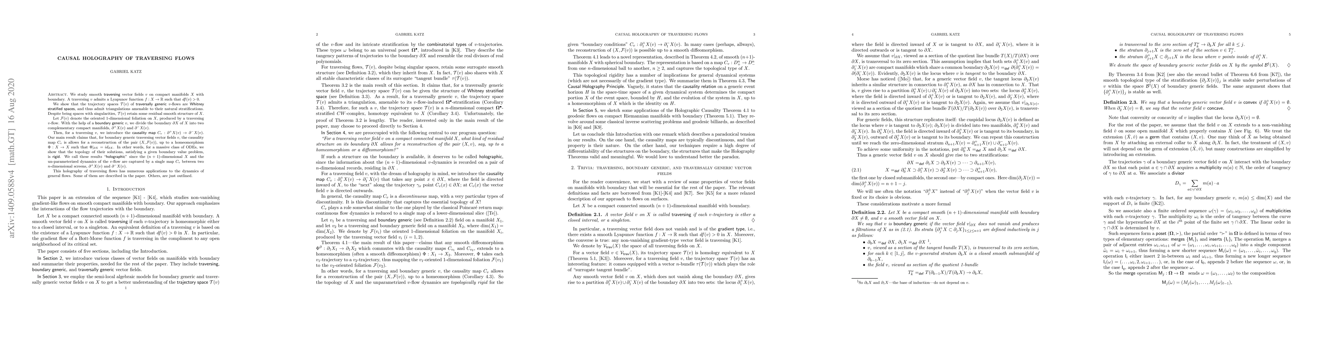We study smooth {\sf traversing} vector fields $v$ on compact manifolds $X$ with boundary. A traversing $v$ admits a Lyapunov function $f: X \to \Bbb R$ such that $df(v) > 0$. We show that the trajectory spaces $\mathcal T(v)$ of {\sf traversally generic} $v$-flows are {\sf Whitney stratified spaces}, and thus admit triangulations amenable to their natural stratifications. Despite being spaces with singularities, $\mathcal T(v)$ retain some residual smooth structure of $X$. Let $\mathcal F(v)$ denote the oriented $1$-dimensional foliation on $X$, produced by a traversing $v$-flow. With the help of a {\sf boundary generic} $v$, we divide the boundary $\partial X$ of $X$ into two complementary compact manifolds, $\partial^+X(v)$ and $\partial^-X(v)$. Then, for a traversing $v$, we introduce the {\sf causality map} $C_v: \partial^+X(v) \to \partial^-X(v)$. Our main result claims that, for boundary generic traversing vector fields $v$, the causality map $C_v$ is allows for a reconstruction of the pair $(X, \mathcal F(v))$, up to a homeomorphism $\Phi: X \to X$ such that $\Phi|_{\partial X} = id_{\partial X}$. In other words, for a massive class of ODEs, we show that the topology of their solutions, satisfying a given boundary value problem, is {\sf rigid}. We call these results ``{\sf holographic}" since the $(n+1)$-dimensional $X$ and the un-parameterized dynamics of the $v$-flow are captured by a single map $C_v$ between two $n$-dimensional screens, $\partial^+X(v)$ and $\partial^-X(v)$. This holography of traversing flows has numerous applications to the dynamics of general flows. Some of them are described in the paper. Others, are just outlined.