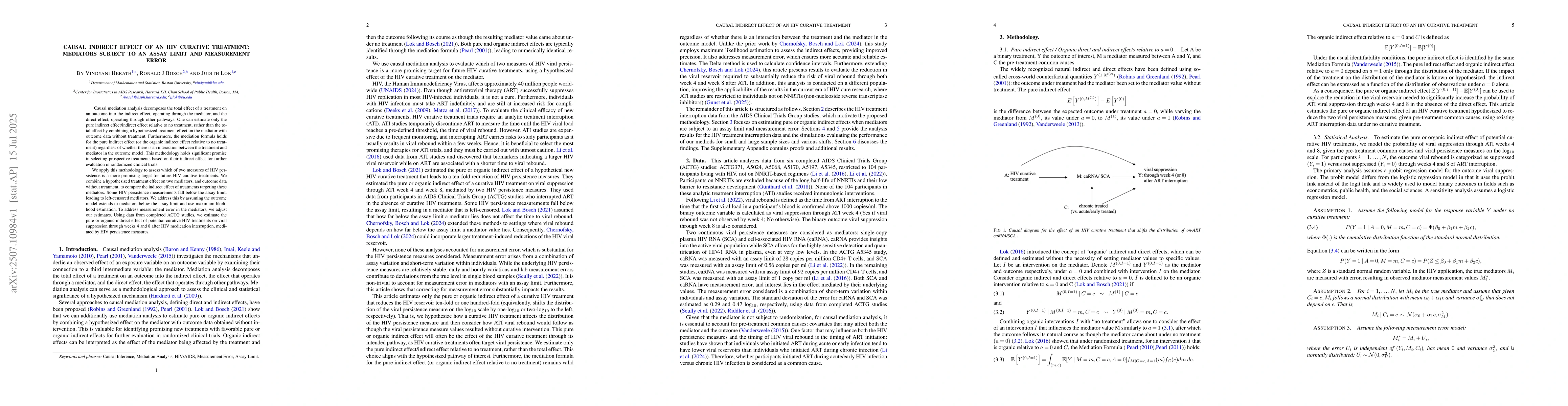 Causal mediation analysis decomposes the total effect of a treatment on an outcome into the indirect effect, operating through the mediator, and the direct effect, operating through other pathways. One can estimate only the pure indirect effect/indirect effect relative to no treatment, rather than the total effect by combining a hypothesized treatment effect on the mediator with outcome data without treatment. Furthermore, the mediation formula holds for the pure indirect effect (or the organic indirect effect relative to no treatment) regardless of whether there is an interaction between the treatment and mediator in the outcome model. This methodology holds significant promise in selecting prospective treatments based on their indirect effect for further evaluation in randomized clinical trials. We apply this methodology to assess which of two measures of HIV persistence is a more promising target for future HIV curative treatments. We combine a hypothesized treatment effect on two mediators, and outcome data without treatment, to compare the indirect effect of treatments targeting these mediators. Some HIV persistence measurements fall below the assay limit, leading to left-censored mediators. We address this by assuming the outcome model extends to mediators below the assay limit and use maximum likelihood estimation. To address measurement error in the mediators, we adjust our estimates. Using data from completed ACTG studies, we estimate the pure or organic indirect effect of potential curative HIV treatments on viral suppression through weeks 4 and 8 after HIV medication interruption, mediated by HIV persistence measures.
