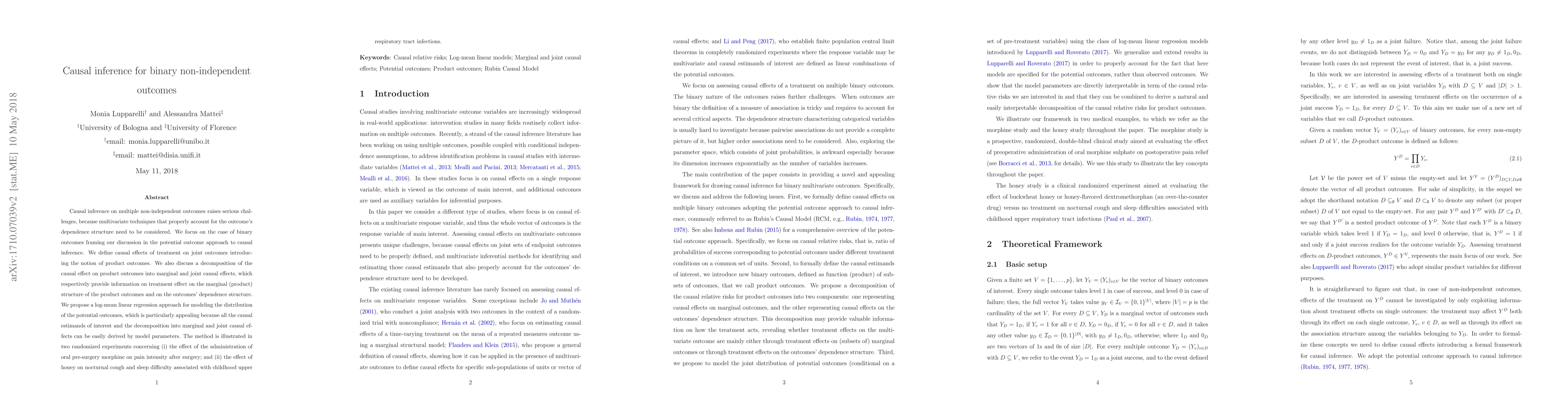 This paper explores causal inference for binary non-independent outcomes, proposing a log-mean linear regression approach to model the joint outcomes' distribution. It introduces product outcomes and decomposes the causal effect into intrinsic and extrinsic components, illustrated through experiments on morphine's effect on post-surgery pain and honey's effect on childhood cough and sleep.