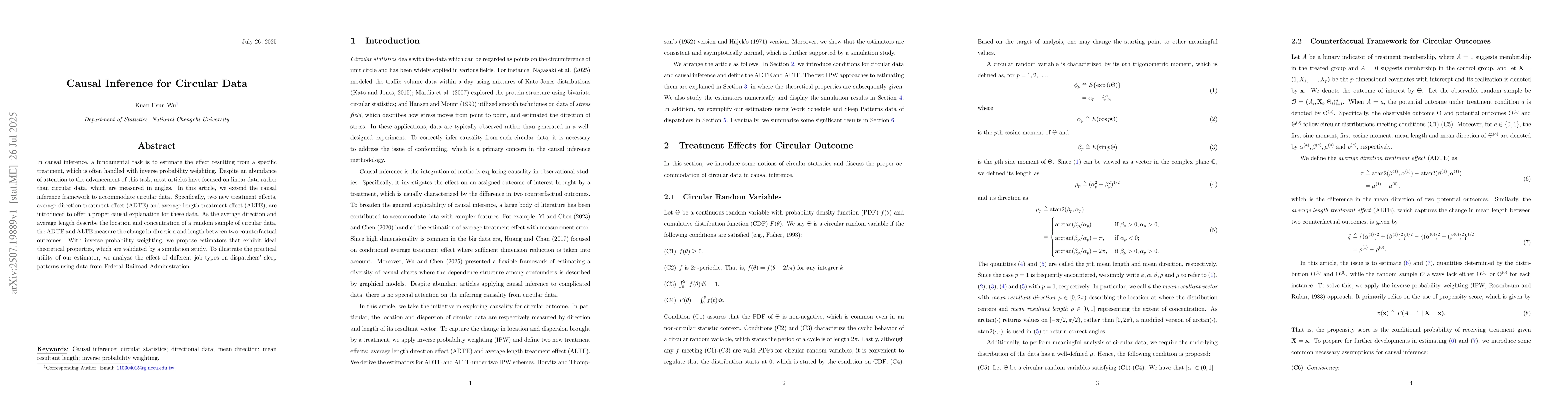 In causal inference, a fundamental task is to estimate the effect resulting from a specific treatment, which is often handled with inverse probability weighting. Despite an abundance of attention to the advancement of this task, most articles have focused on linear data rather than circular data, which are measured in angles. In this article, we extend the causal inference framework to accommodate circular data. Specifically, two new treatment effects, average direction treatment effect (ADTE) and average length treatment effect (ALTE), are introduced to offer a proper causal explanation for these data. As the average direction and average length describe the location and concentration of a random sample of circular data, the ADTE and ALTE measure the change in direction and length between two counterfactual outcomes. With inverse probability weighting, we propose estimators that exhibit ideal theoretical properties, which are validated by a simulation study. To illustrate the practical utility of our estimator, we analyze the effect of different job types on dispatchers' sleep patterns using data from Federal Railroad Administration.