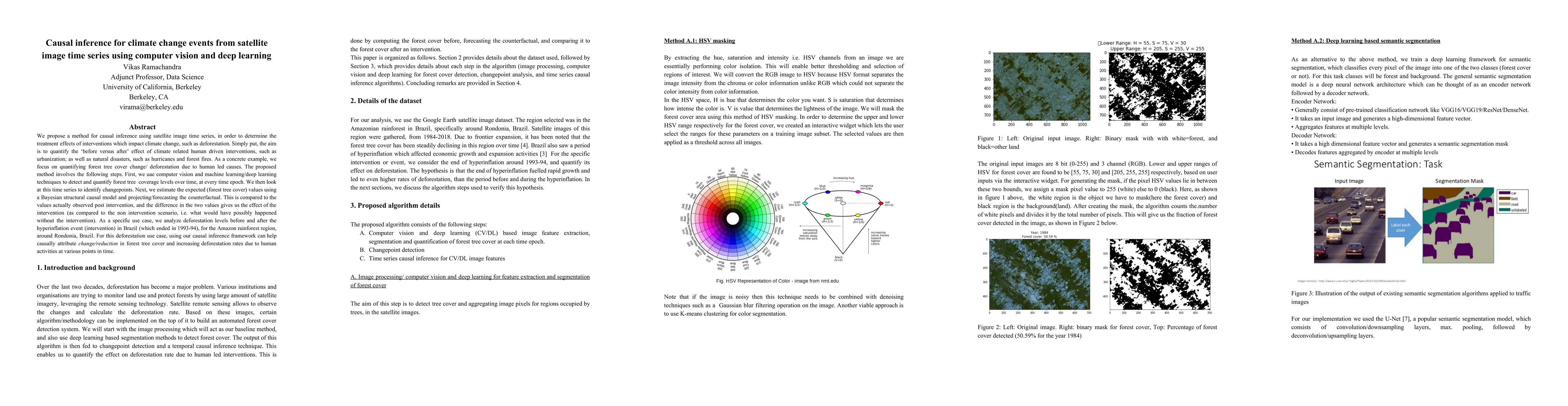 We propose a method for causal inference using satellite image time series, in order to determine the treatment effects of interventions which impact climate change, such as deforestation. Simply put, the aim is to quantify the 'before versus after' effect of climate related human driven interventions, such as urbanization; as well as natural disasters, such as hurricanes and forest fires. As a concrete example, we focus on quantifying forest tree cover change/ deforestation due to human led causes. The proposed method involves the following steps. First, we uae computer vision and machine learning/deep learning techniques to detect and quantify forest tree coverage levels over time, at every time epoch. We then look at this time series to identify changepoints. Next, we estimate the expected (forest tree cover) values using a Bayesian structural causal model and projecting/forecasting the counterfactual. This is compared to the values actually observed post intervention, and the difference in the two values gives us the effect of the intervention (as compared to the non intervention scenario, i.e. what would have possibly happened without the intervention). As a specific use case, we analyze deforestation levels before and after the hyperinflation event (intervention) in Brazil (which ended in 1993-94), for the Amazon rainforest region, around Rondonia, Brazil. For this deforestation use case, using our causal inference framework can help causally attribute change/reduction in forest tree cover and increasing deforestation rates due to human activities at various points in time.